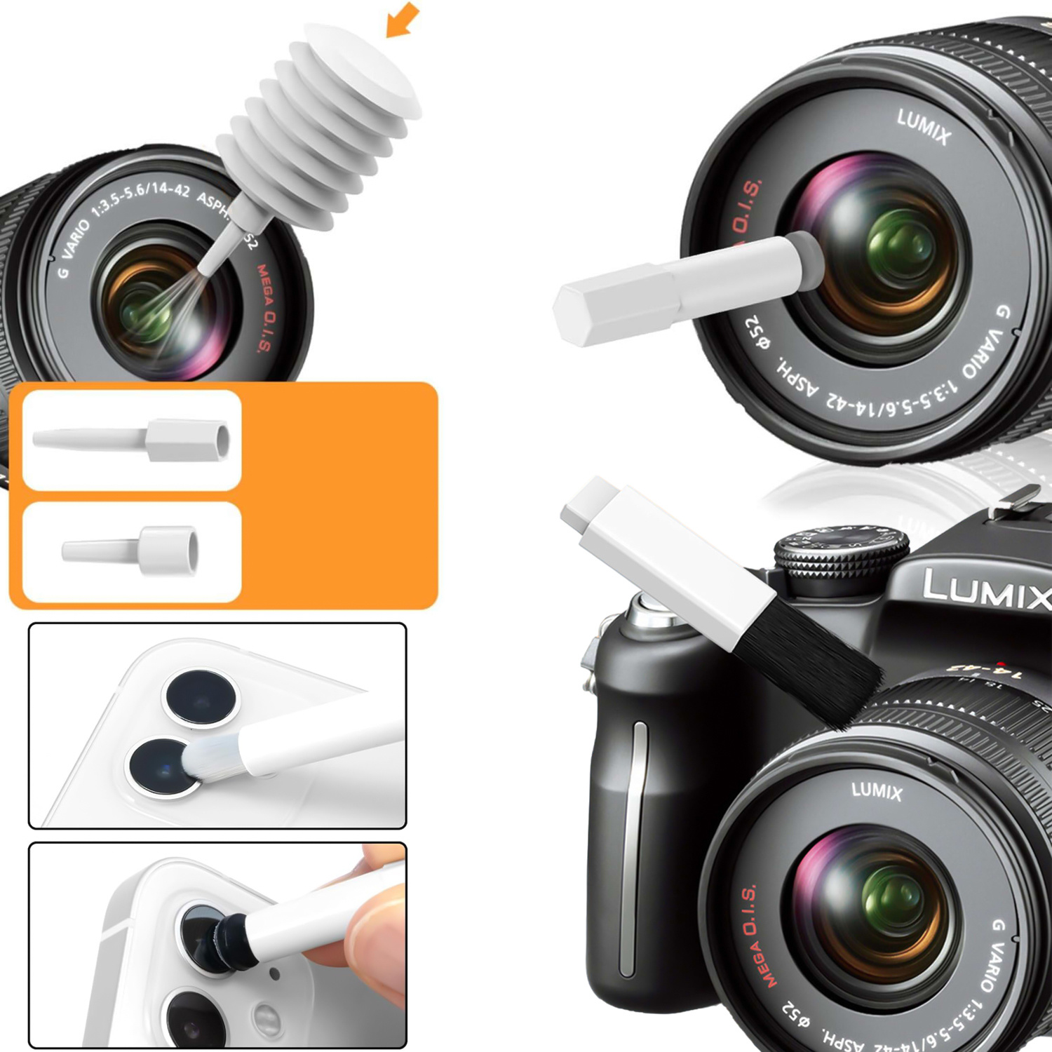 Reinigungsstift und Blasebalg für Kameraobjektive : Entfernen Sie effektiv Fingerabdrücke, Staub und andere Verunreinigungen, die die Bildqualität von Smartphones und Kameraobjektiven beeinträchtigen können.