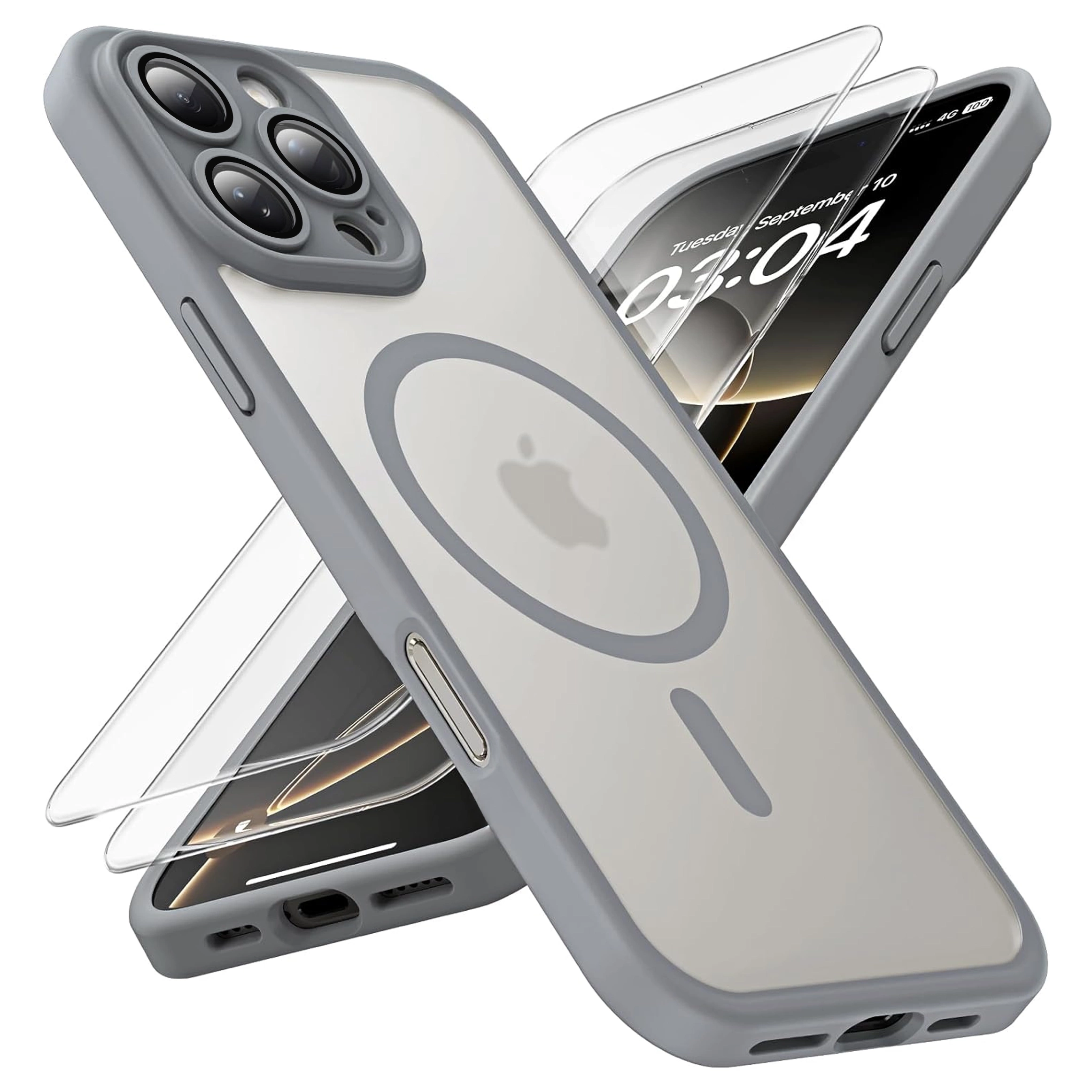 3-in-1-Hybrid-Schutzhüllen-Set mit 2 Displayschutzfolien aus gehärtetem Glas für Apple iPhone 16 Pro Max, MagSafe Hybrid-Schutzhülle mit Linsenschutz, Alogy 3-in-1-Hüllen-Set, Titangrau x 1