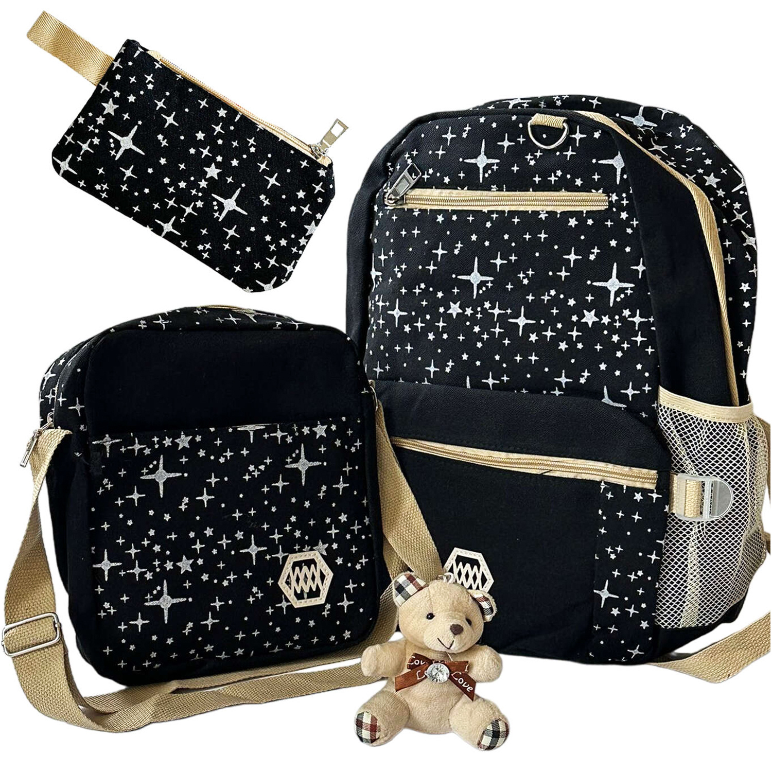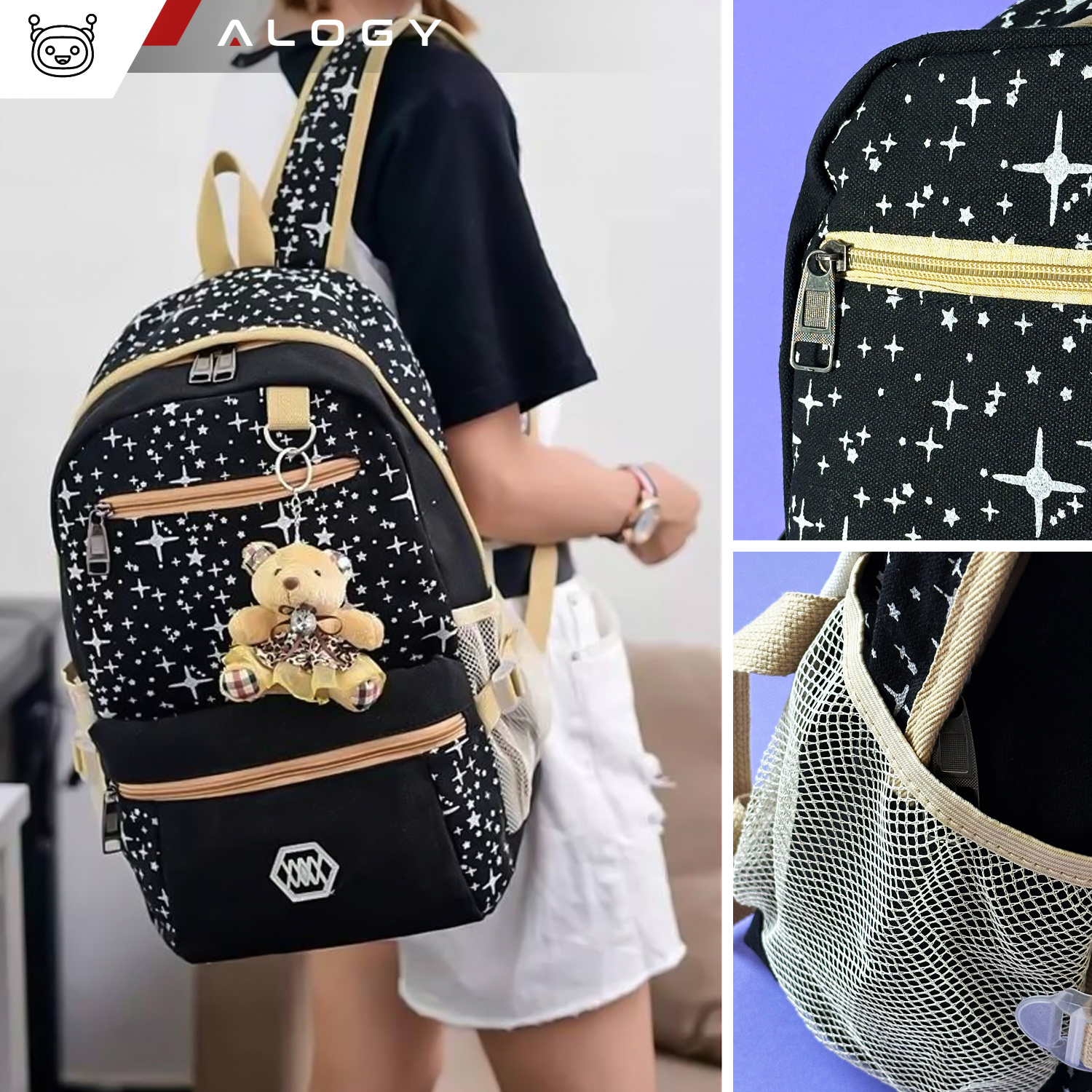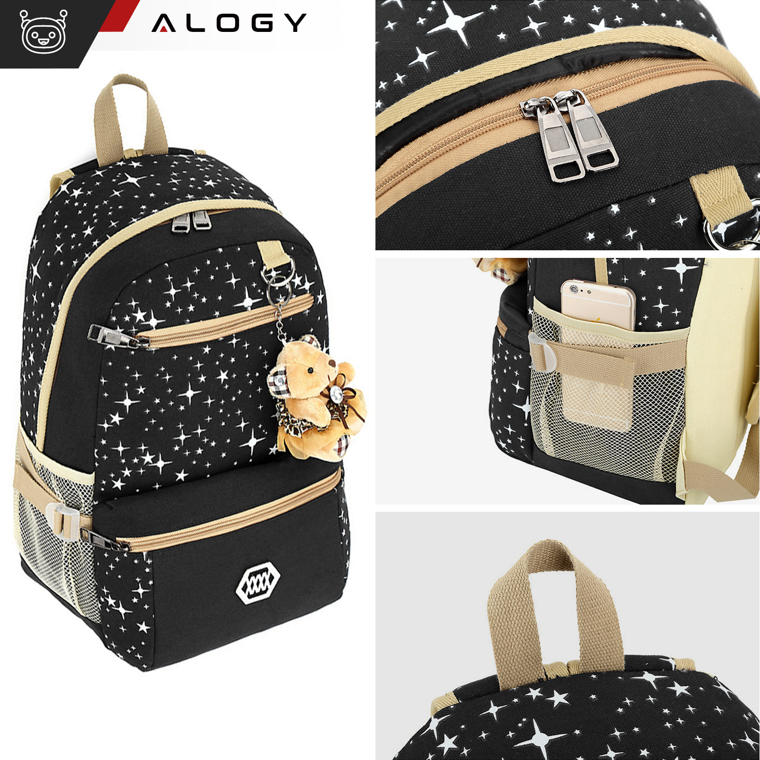 3in1 Rucksack Schule Urban Jugend Schultasche Federmäppchen Kosmetiktasche Schlüsselanhänger Teddybär Geräumig Damen Schwarz mit Sternen Alogy x 1