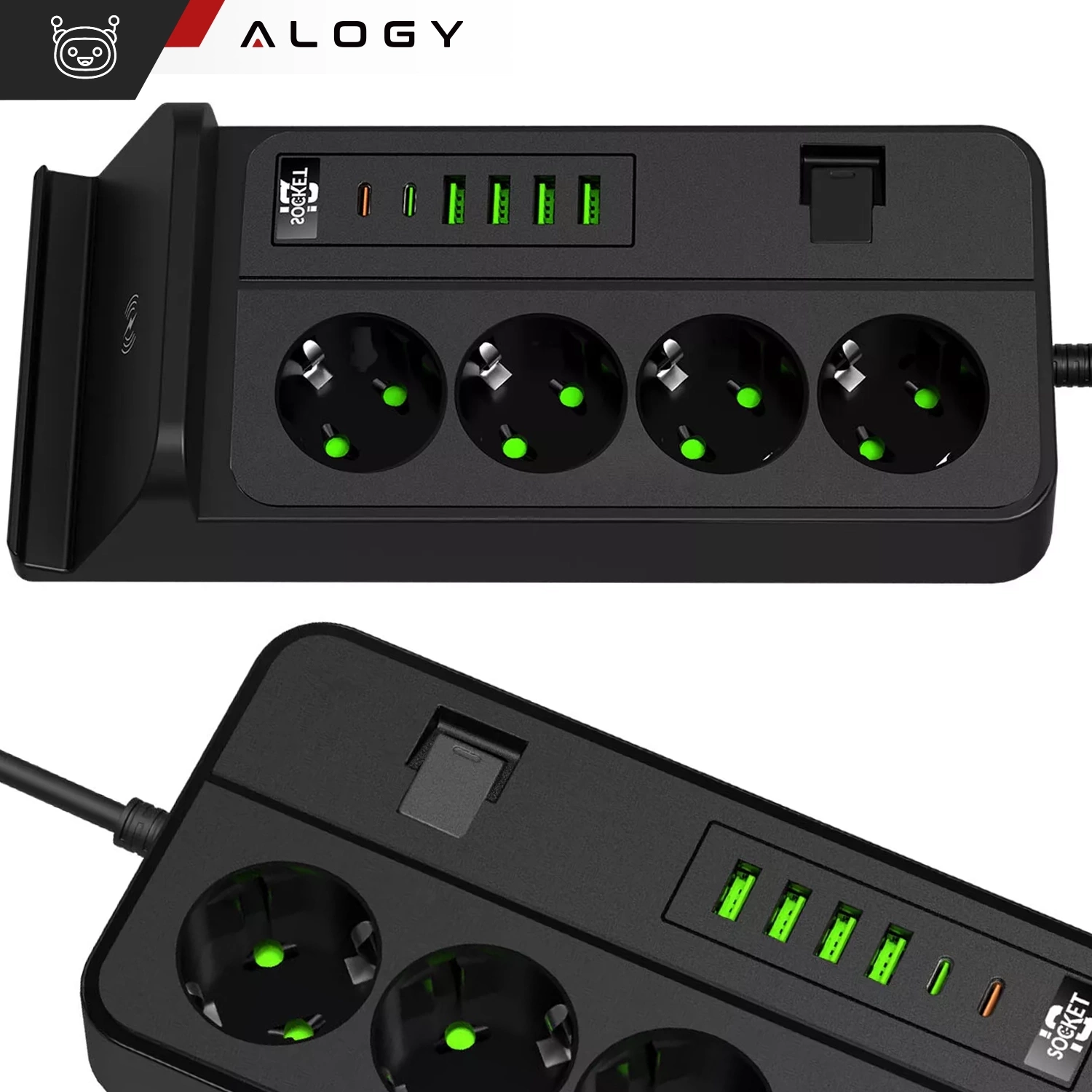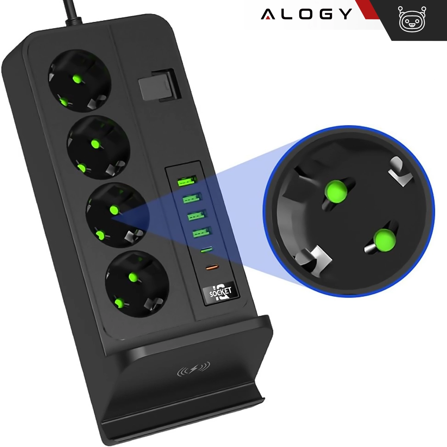 Alogy Plug Extender Steckdosenverteiler Splitteradapter Verlängerungskabel mit Qi-Induktionsladegerät 4x EU-Stecker 4x USB 2x USB-C Schwarz x 1