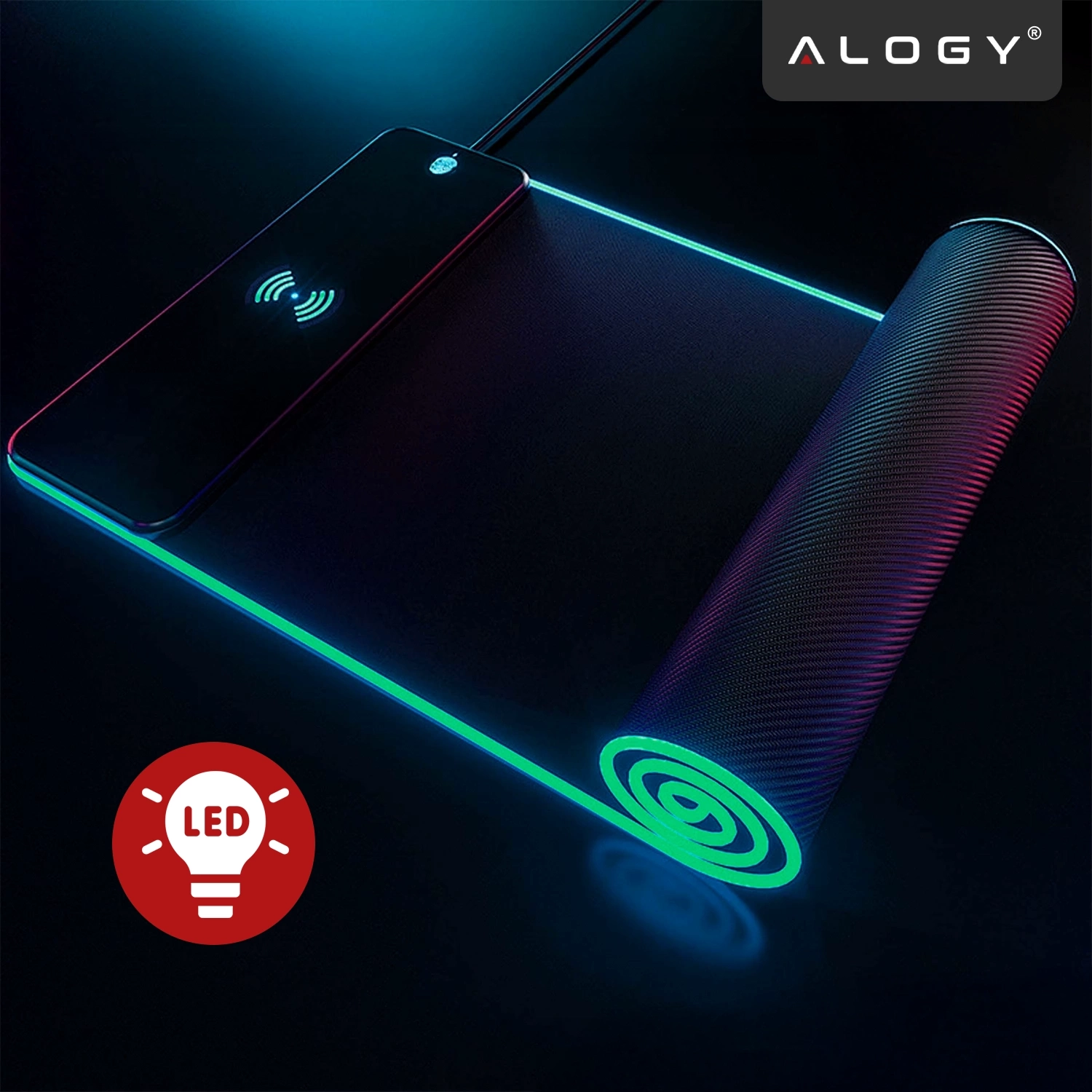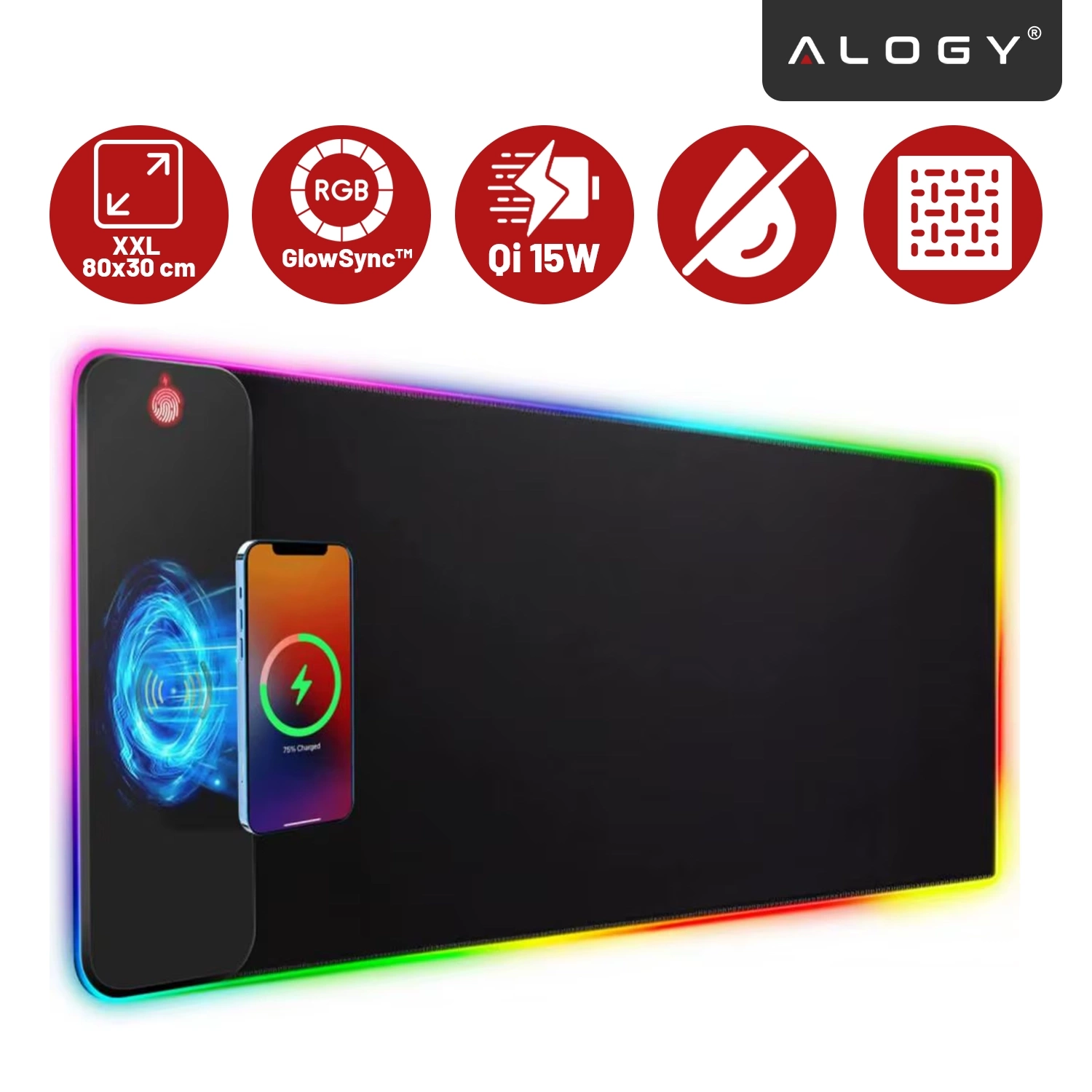 Alogy QiGlow Pro Schreibtischunterlage mit RGB-LED-Beleuchtung für Maus, Tastatur und Qi-Ladegerät für Smartphones. Rutschfeste, schützende Gaming-Matte XL (80 x 30 cm), Schwarz. x 1