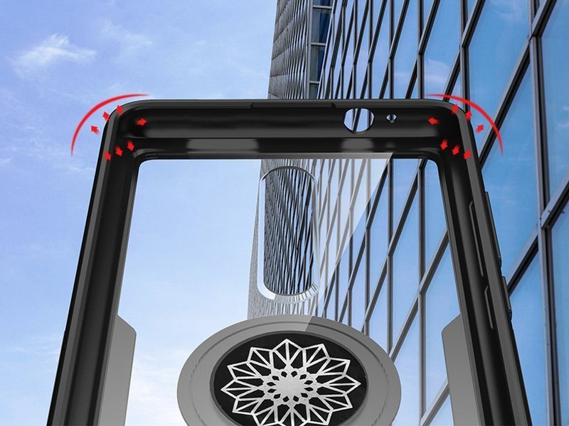 Die Rückseite des Gehäuses besteht aus transparentem Polycarbonat , in dessen Mitte sich ein um 360 Grad drehbarer, funktionaler , ringförmiger Griff befindet . Es kann als Ständer verwendet werden, sodass Sie bequem den Inhalt des Geräts durchsuchen oder Filme ansehen können. Im mittleren Teil hat es eine Metallplatte, die mit allen Magnethaltern kompatibel ist. Zusätzlich kann der Ring auch als Fingerhaken für sicheren Halt dienen. Die Abdeckung hat außerdem einen Schutzrand, der leicht über den Rand des Displays und der Kamera hinausragt und diese so vor Kratzern und Beschädigungen schützt (kein Bodenkontakt).