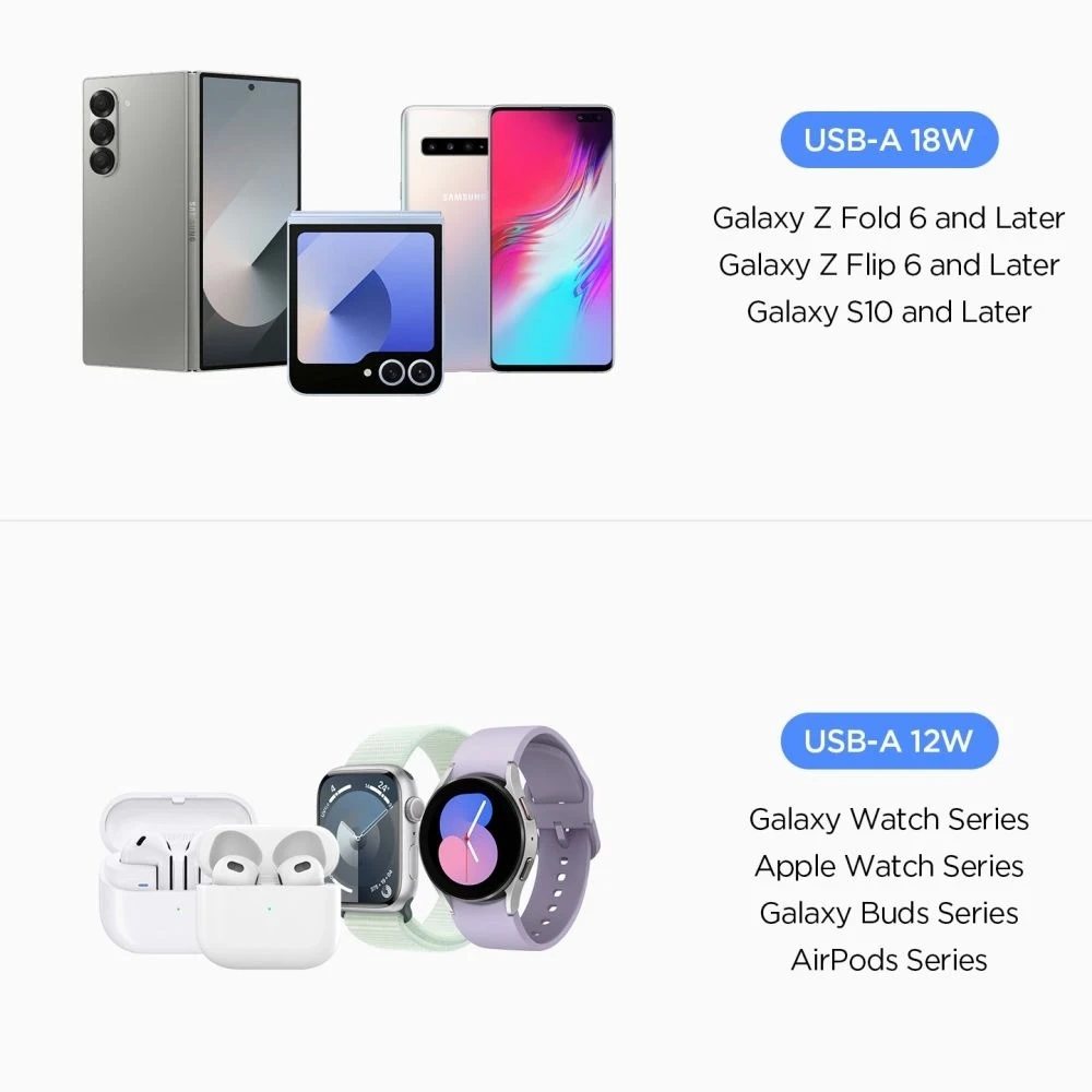 Zwei USB-A-Anschlüsse ermöglichen das gleichzeitige Laden von zwei Geräten und sorgen für superschnelles Laden – 18 W für Smartphones und Tablets und 12 W für Smartwatches und Kopfhörer. Ausgestattet mit fortschrittlichem Batterieschutz bietet es Technologien zum Schutz vor Überladung, Überhitzung und Kurzschluss und sorgt so für maximale Sicherheit Ihrer Geräte.