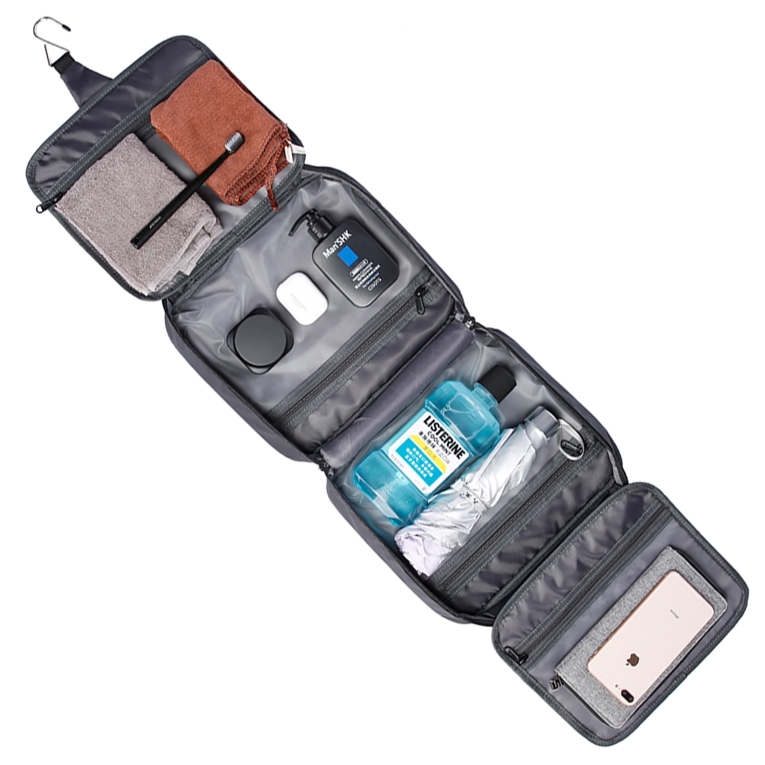 Die Tasche ist mit einem Aufhängehaken ausgestattet. Das macht sie praktisch und sorgt für Ordnung im Badezimmer – platzsparend und praktisch.