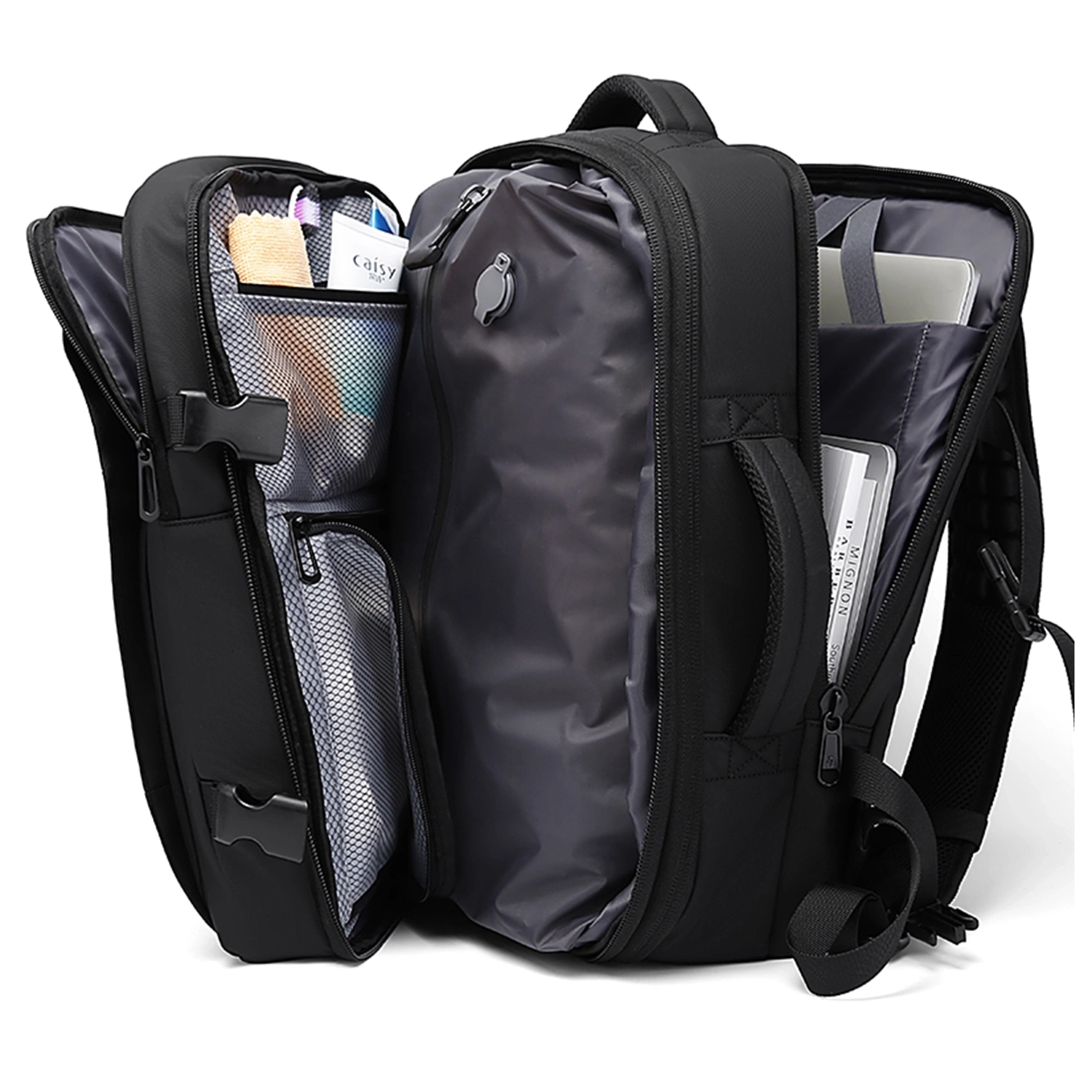 ✅ Das Hauptfach des Rucksacks lässt sich wie ein Koffer öffnen und verfügt über ein Fach zum Vakuumieren (eine elektrische Vakuumpumpe ist im Set enthalten) sowie zwei wasserdichte Reißverschlusstaschen, die sich ideal zur Aufbewahrung von Kosmetikartikeln eignen.