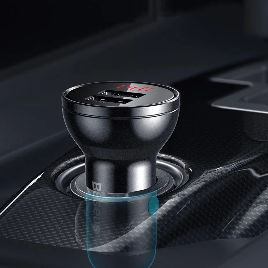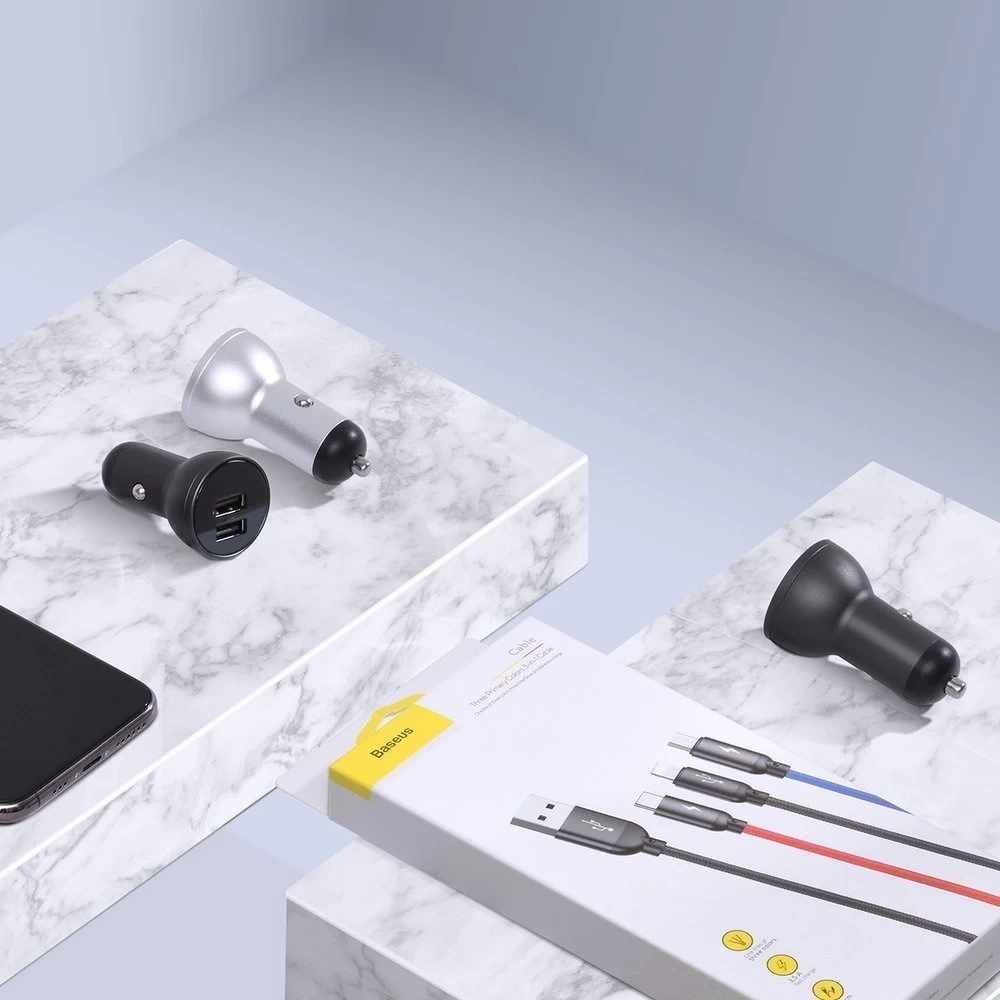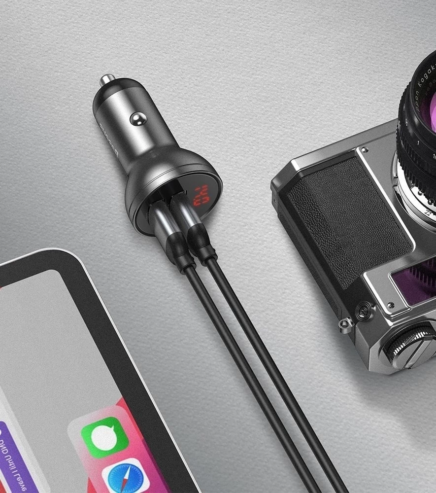 Baseus Kit Autoladegerät 2x USB 4.8A 24W mit LCD + 3in1 USB - USB Type C / Micro USB / Lightning 1,2m Kabel: