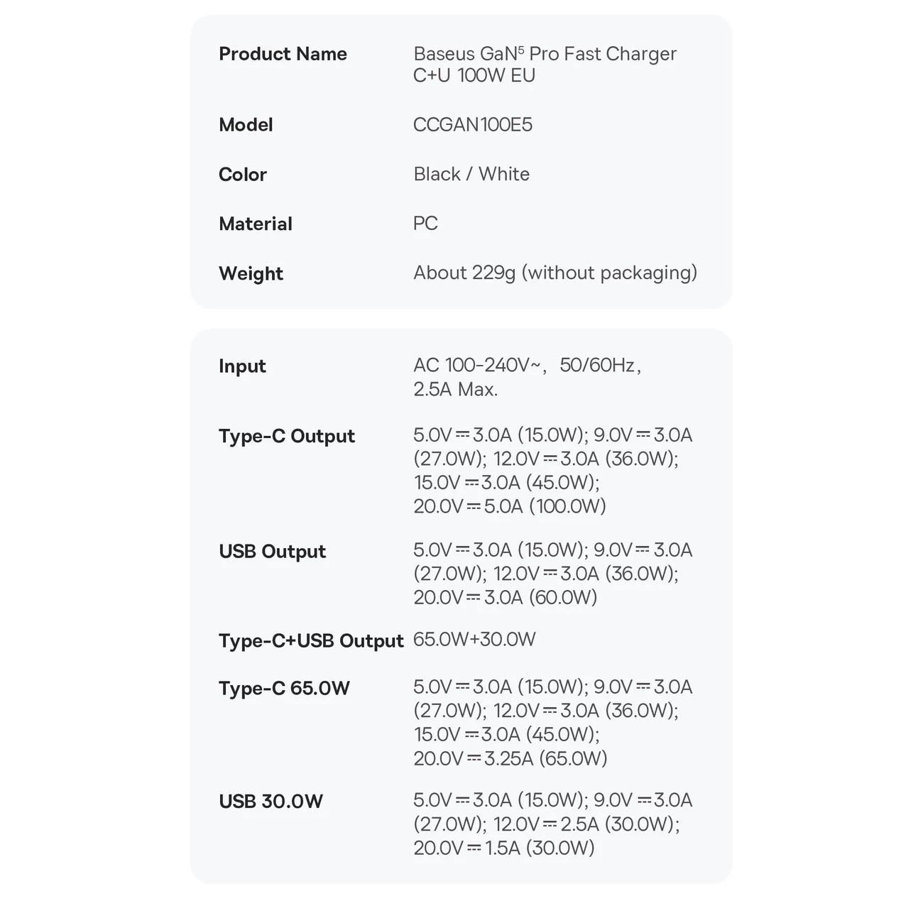 Baseus GaN5 Pro Fast Universal GaN USB Ladegerät Typ C / USB 100W PD3.0, QC4.0, AFC weiß (CCGP090202) x 1