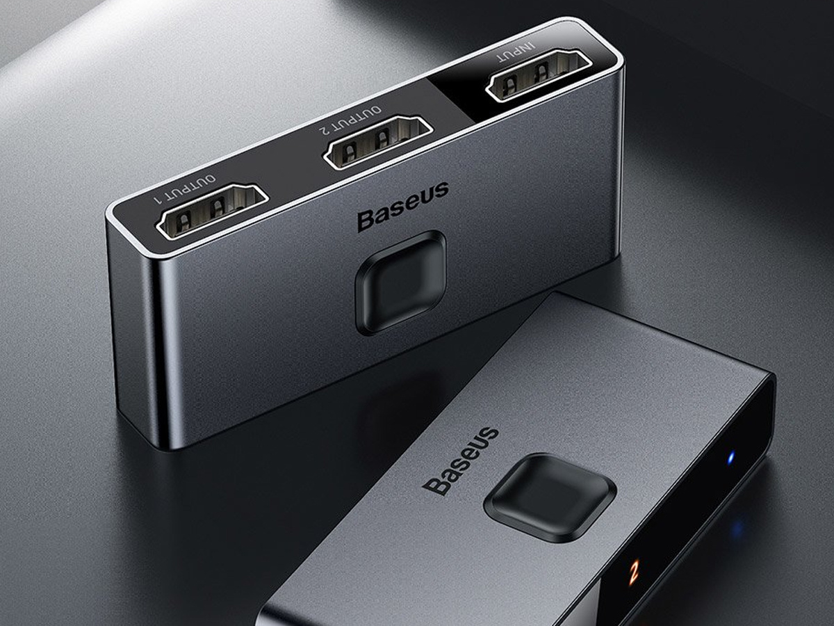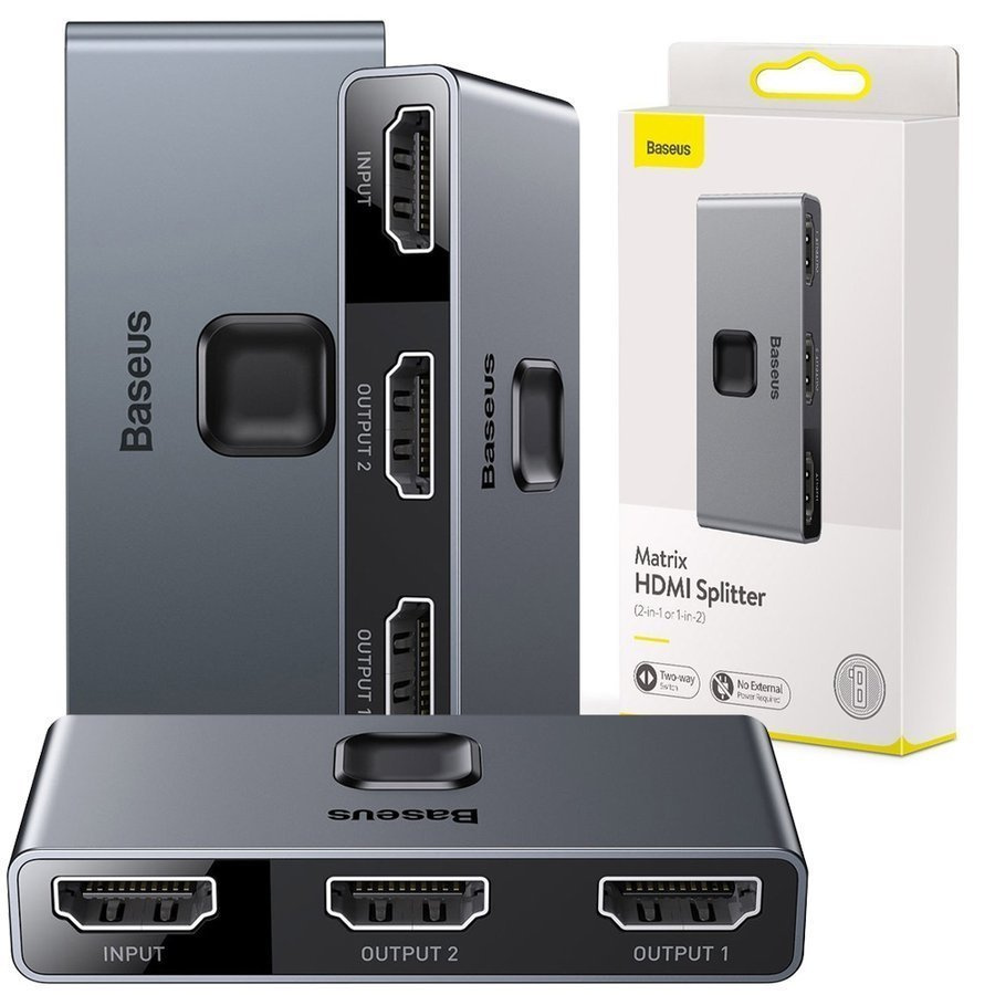 Der Baseus Matrix HDMI Switcher Adapter ist ein Multischalter , mit dem Sie das Signal von Quellgeräten, die mit dem HDMI-Standard ausgestattet sind, gleichzeitig oder unabhängig voneinander an HDMI-Geräte verteilen können (das Gerät ermöglicht Ihnen, zwei Bildschirme gleichzeitig anzuschließen, aber das Bild wird auf einem ausgewählten angezeigt werden). Der Splitter wurde mit einer Verstärkerfunktion angereichert, mit der Sie das durch HDMI-Kabel mit beträchtlicher Länge geschwächte HDMI-Signal verstärken können.