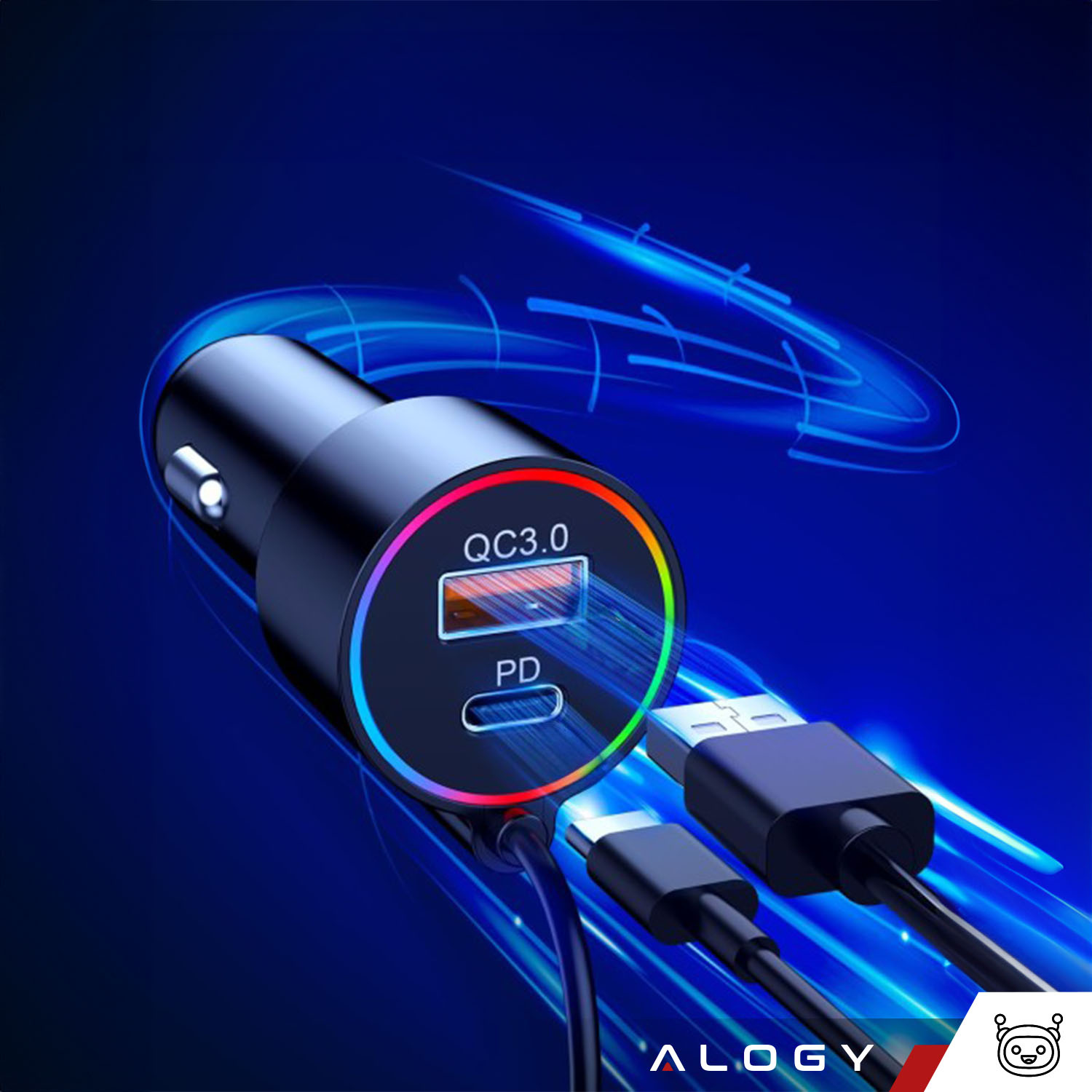 Ladegerät mit zwei Ladeanschlüssen QC 3.0 (Schnellladung) und PD (Power Delivery), flexibel mit Bluetooth-Sender verbunden , dehnbares Kabel.