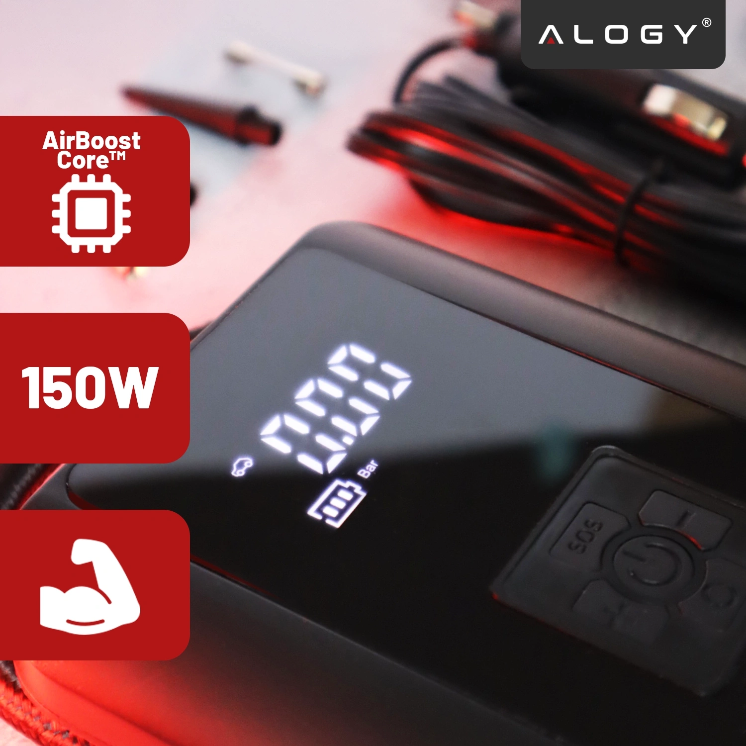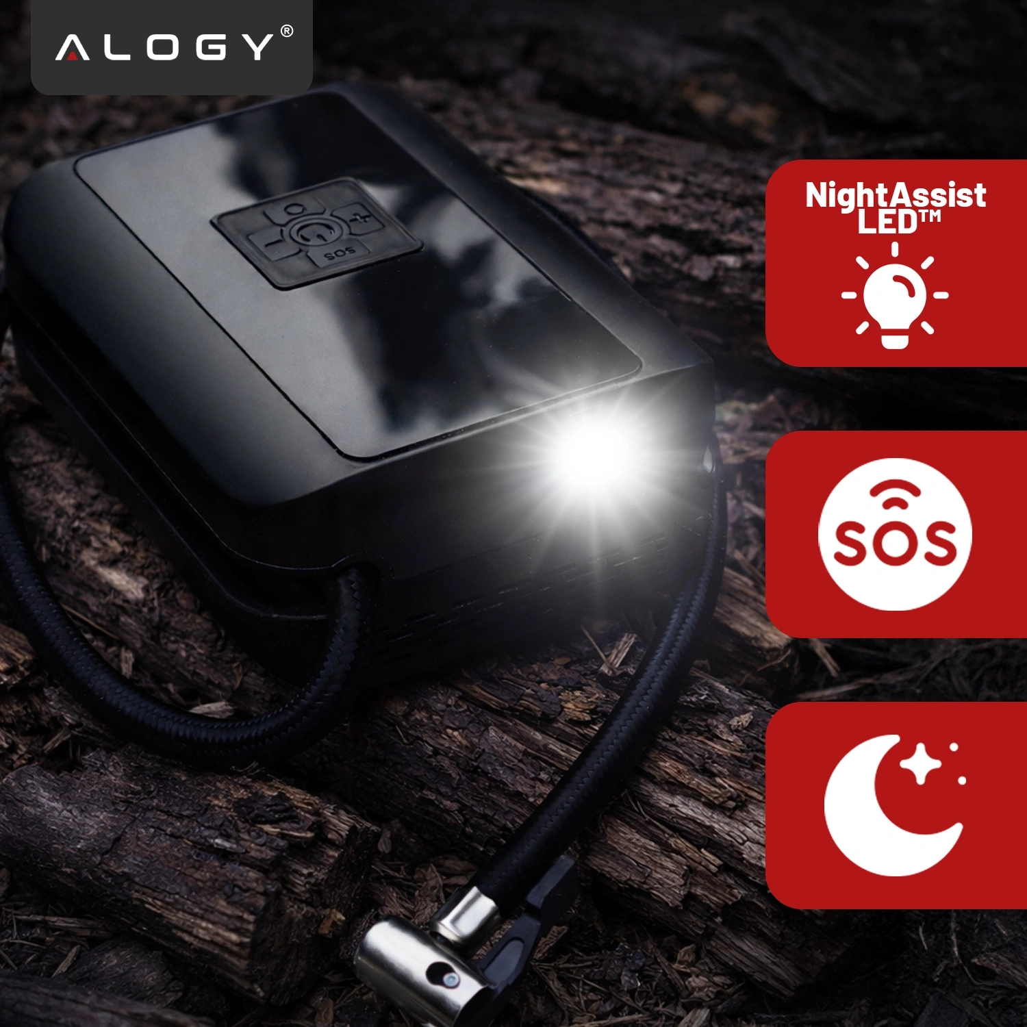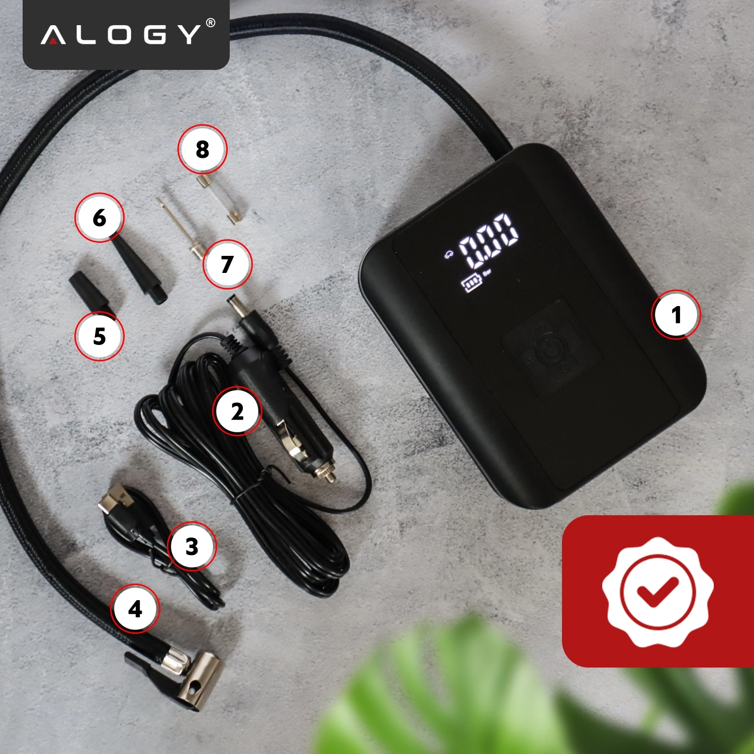 • Elektrische Fahrradpumpe Akku-Autokompressor Tragbar mit Taschenlampe Alogy für Autos, Fahrräder und Bälle. Automatisches Aufblasen, eingebautes Licht, Manometer. Kompakt, einfach zu bedienen, USB-Aufladung. Perfekt für jeden Anlass!