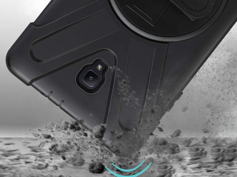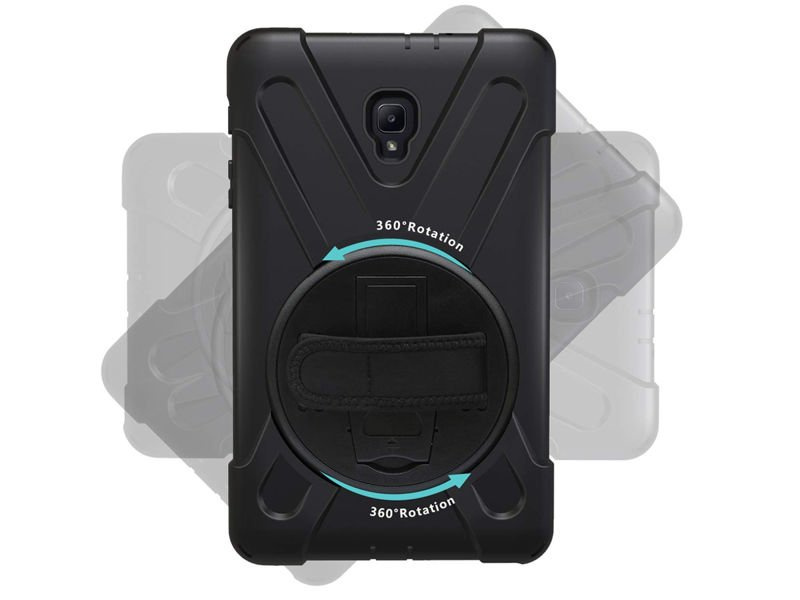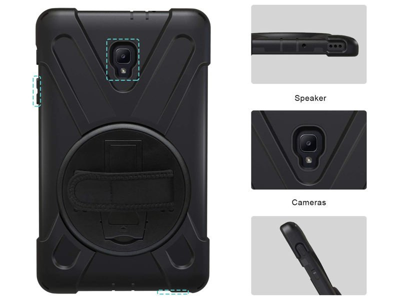 Der große Vorteil der Hülle ist der starke Klettverschluss, der auf der Rückseite des Gehäuses platziert wurde. Mit dem Klettverschluss lässt sich das Gerät an der Hand befestigen, sodass Sie sicher sein können, dass Ihnen das Galaxy Tab A 8.0 z.B. beim Fotografieren nicht aus der Hand fällt. Zusätzlich hat der Hersteller das Gehäuse mit einem abnehmbaren Riemen ausgestattet, der am Deckel befestigt werden kann. Gürtel inkl. ermöglicht es Ihnen, das Gerät an der Kopfstütze zu befestigen, wodurch unser Tablet auf langen Fahrten als großartige Unterhaltungsquelle genutzt werden kann.