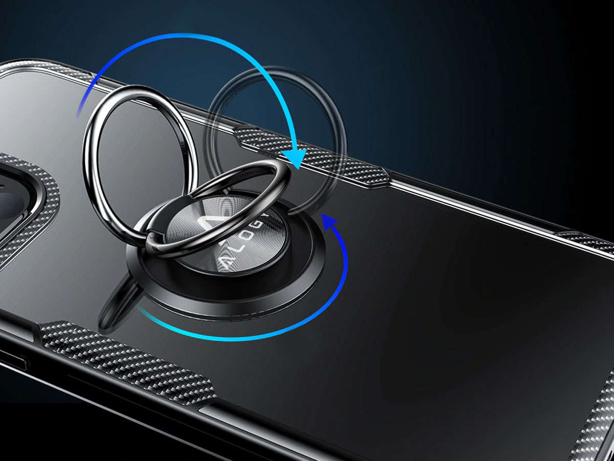 Die Rückseite des Gehäuses besteht aus transparentem Polycarbonat, in dessen Mitte sich ein um 360 Grad drehbarer , funktionaler, ringförmiger Griff befindet . Es kann als Ständer verwendet werden, sodass Sie bequem den Inhalt des Geräts durchsuchen oder Filme ansehen können. Im Mittelteil hat es eine Metallplatte, die mit allen Magnethaltern kompatibel ist. Zusätzlich kann der Ring auch als Fingerhaken für sicheren Halt dienen. Die Abdeckung hat außerdem einen Schutzrand , der leicht über den Rand des Displays und der Kamera hinausragt und diese so vor Kratzern und Beschädigungen schützt (kein Bodenkontakt).