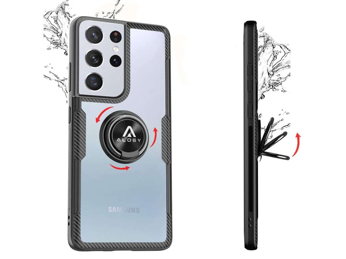 Die dem Samsung Galaxy S21 Ultra gewidmete Alogy-Ringhalterhülle ist ein Produkt, das aus einer Kombination von zwei hochwertigen Materialien besteht; flexibles TPU und haltbares Polycarbonat.