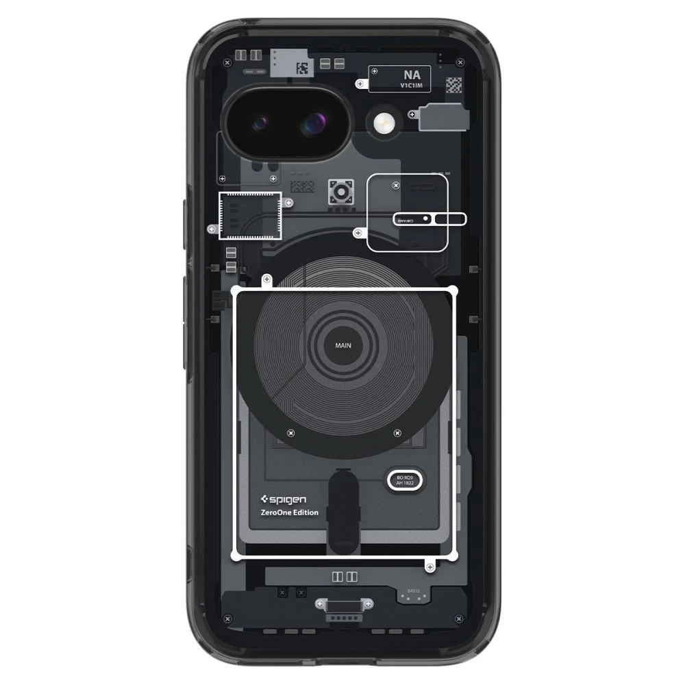 Schützen Sie Ihr Smartphone, ohne seinen einzigartigen Stil zu verdecken! Die Spigen Ultra Hybrid MagSafe -Hülle für Google Pixel 9a in Zero One Black hat ein transparentes Design mit schwarzen Akzenten, inspiriert von einem technischen Diagrammmotiv.