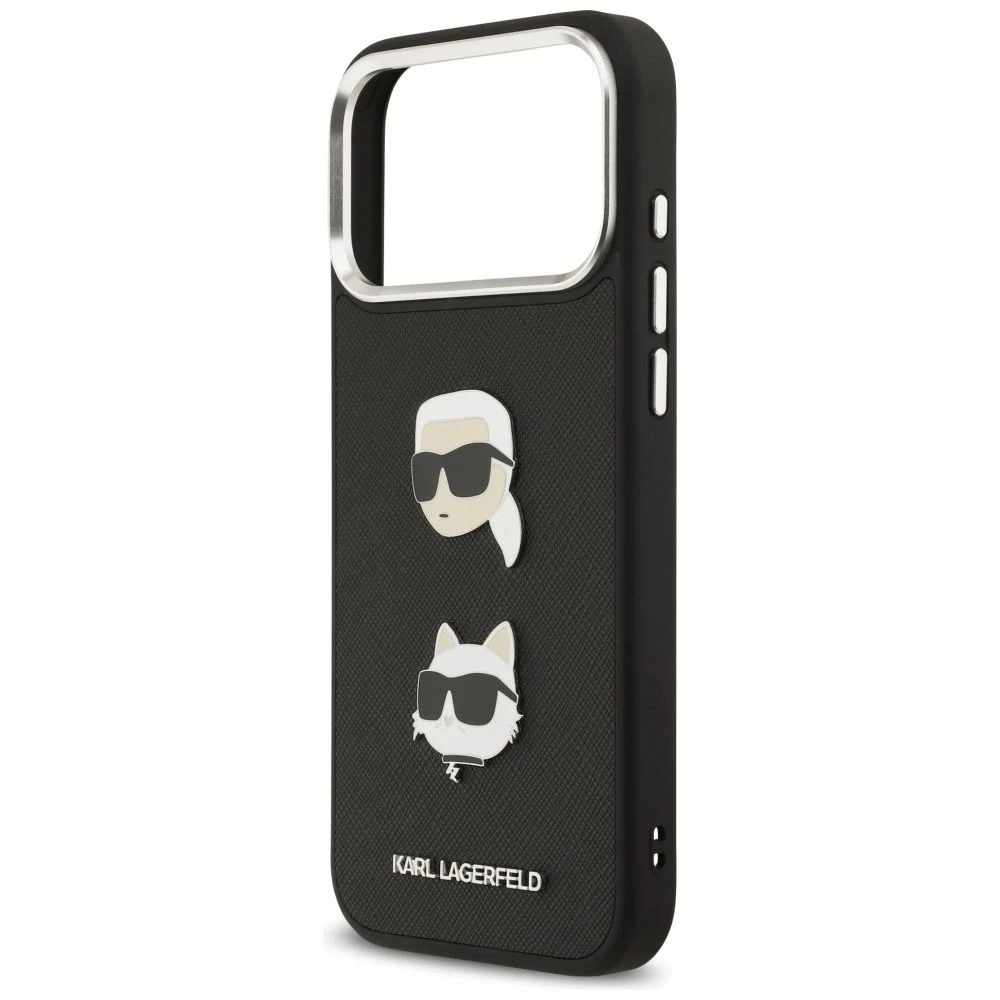 Etui Karl Lagerfeld FW Grained Karl & Choupette Heads Pins & Logo do iPhone 17 Pro Max to wyjątkowe połączenie elegancji i niezawodnej ochrony. Czarne wykończenie z ziarnistą fakturą oraz ozdobne pinsy z motywem Karl & Choupette sprawiają, że etui wyróżnia się na tle innych akcesoriów, stając się modnym dodatkiem klasy premium.