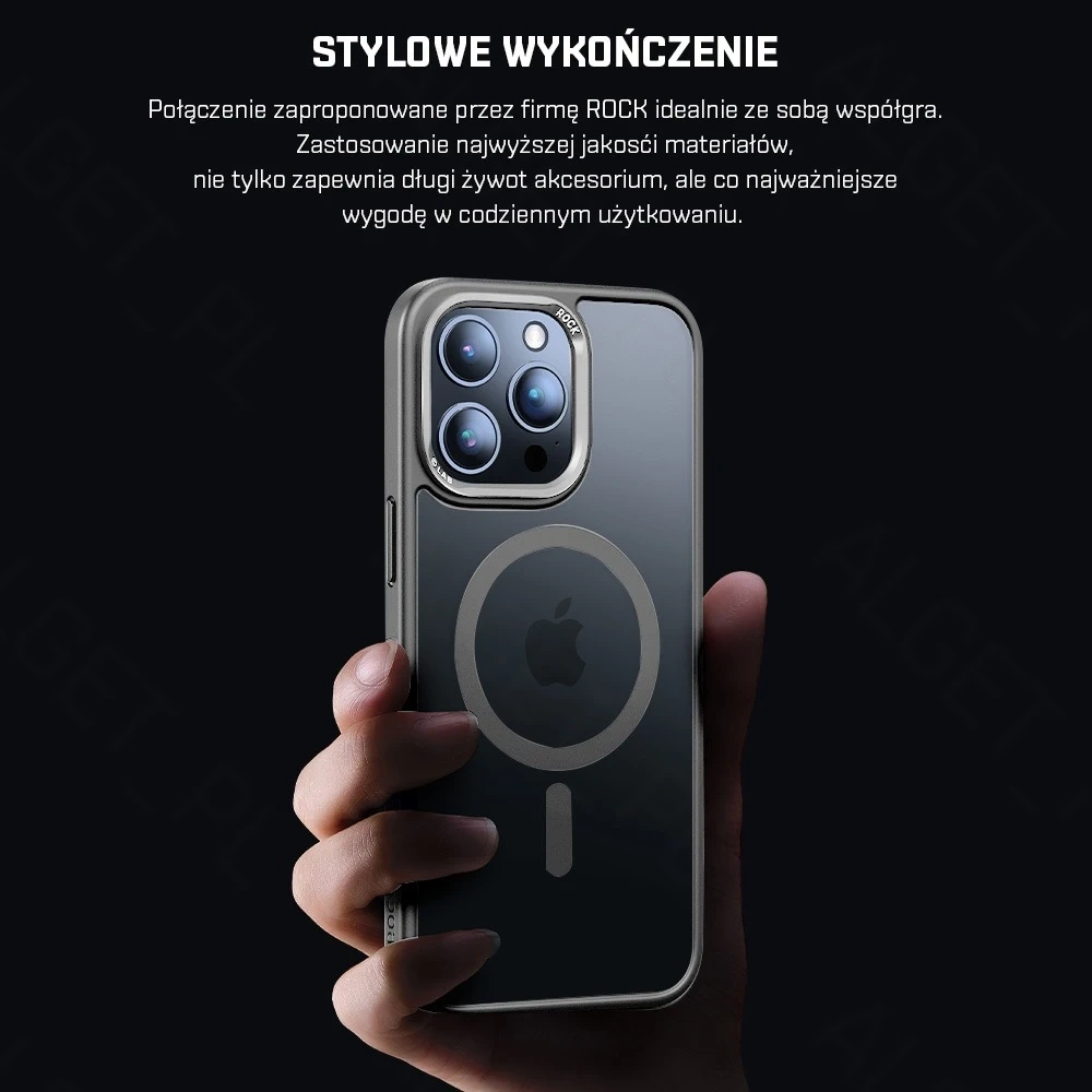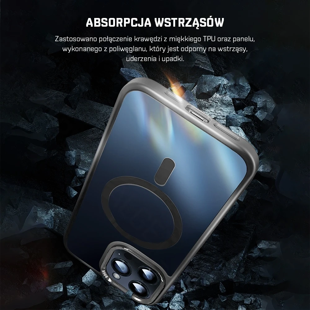 ROCK Metal Lens MagSafe-Hülle für iPhone 15 Pro 6,1" - Dies ist ein Koffer der renommierten Marke ROCK. Es besteht aus hochwertigem, langlebigem und flexiblem PC und TPU, was die Anwendung äußerst einfach macht. Schützt das Telefon vor Kratzern und Stößen. Die Aluminiumabdeckung rund um die Kamera bietet hervorragenden Schutz für die Objektive. Perfekt profiliertes Gehäuse sorgt für komfortable Nutzung und festen Halt. Spezielle Löcher verdecken weder das Mikrofon noch den Lautsprecher und ermöglichen einen einfachen Zugang zum Ladeanschluss. Die Abdeckung ist außerdem mit einem Magnetring ausgestattet, der mit der MagSafe-Technologie kompatibel ist. Die Hülle hat ein modernes Design – die matte Rückseite und der schwarze Rand schaffen eine interessante und ungewöhnliche Komposition, dank der sich Ihr Telefon von der Masse abhebt.
