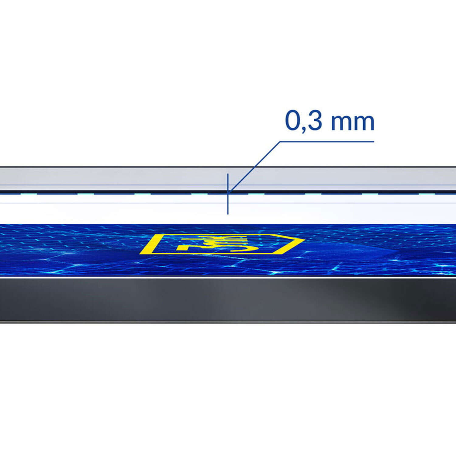 Im Falle eines Sturzes absorbiert das Glas die volle Wucht des Aufpralls und schützt das Display so vor Bruch und Kratzern.