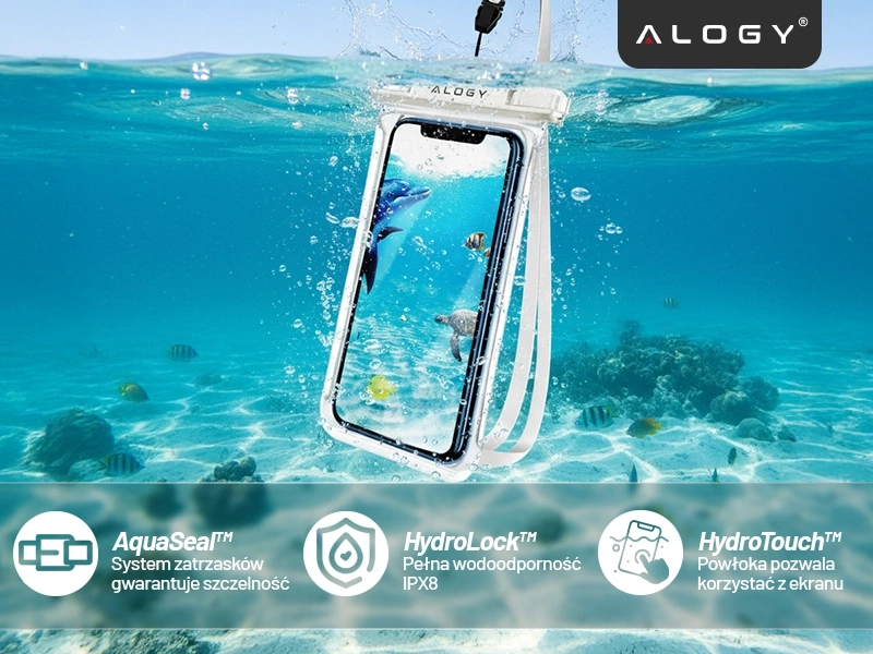 Eine wasserdichte, universelle Alogy-Hülle mit einem praktischen und sicheren Schließsystem, das Ihr Telefon vor Wasser oder Sand schützt.