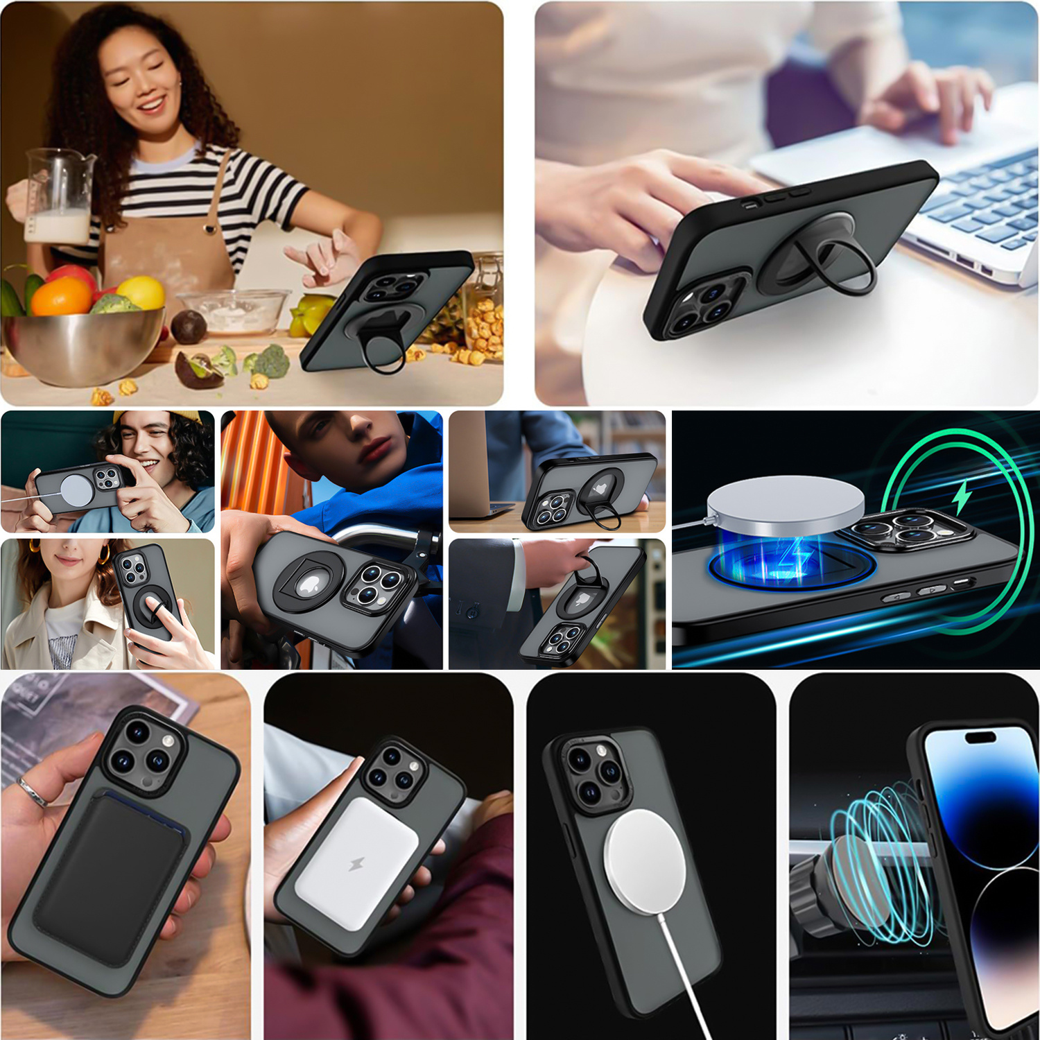 Die Alogy-Hülle ist auch kompatibel mit allen Mag Safe-Zubehörteilen und verfügt zusätzlich über einen drehbaren Griff am Rückseite und ermöglicht induktives Laden, was es zur idealen Wahl für diejenigen macht, die verschiedene Funktionen ihres iPhones nutzen.