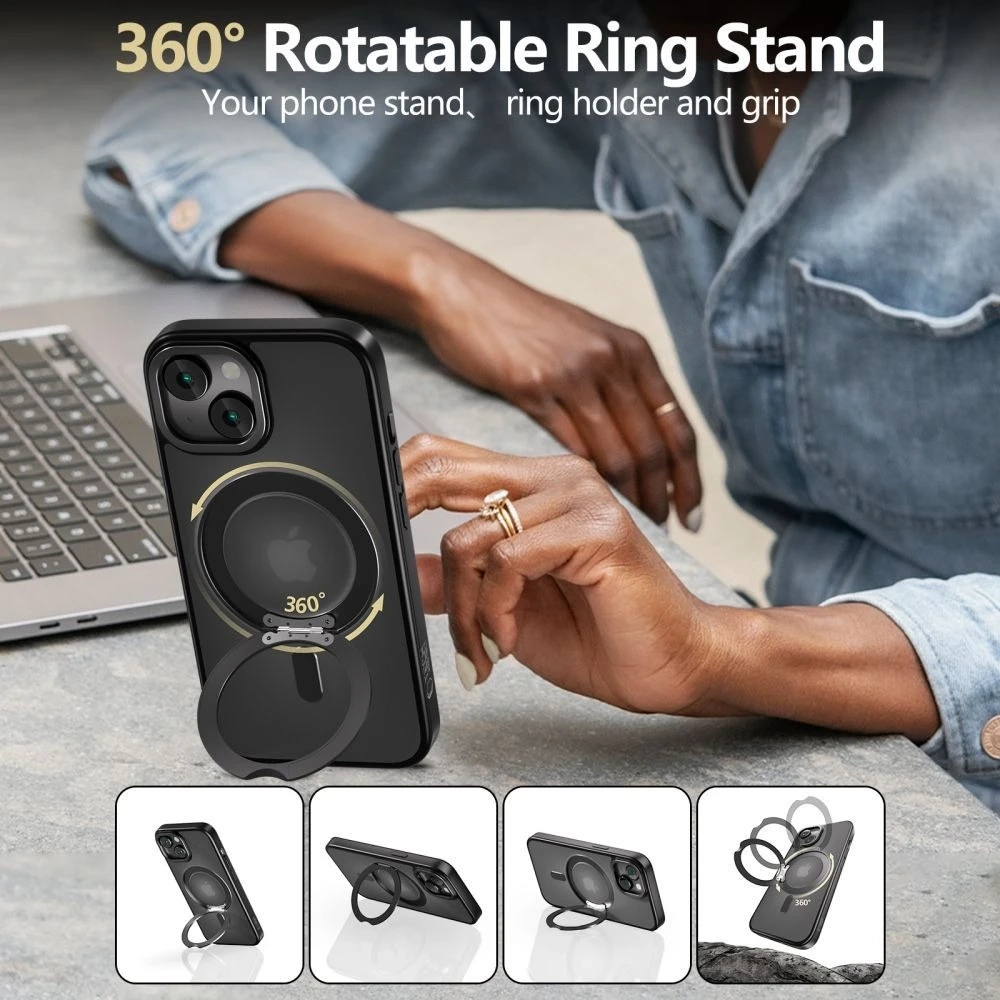 Das Schlüsselelement der Hülle ist der bewegliche Ring, der sich um 360 Grad drehen lässt und so verschiedene Verwendungsmöglichkeiten bietet – als Ständer zum bequemen Filmeschauen, als Fingerhalterung für einen sichereren Griff des Telefons und als Unterstützung der MagSafe-Funktion. Dank der MagSafe-Eigenschaften funktioniert es perfekt mit MagSafe-Zubehör wie Ladegeräten oder Magnethalterungen.