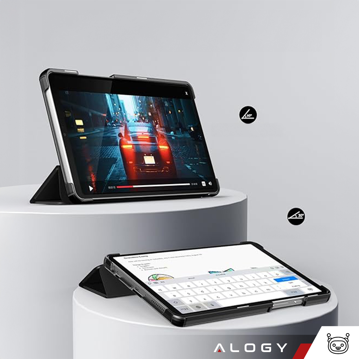 Die Hülle verfügt über eine Sleep/Wake-Up-Funktion, die das Gerät automatisch aufweckt oder in den Ruhezustand versetzt, wenn Sie die Klappe öffnen oder schließen. Darüber hinaus lässt es sich zu einem bequemen Ständer zum Schreiben oder Ansehen von Filmen zusammenklappen.