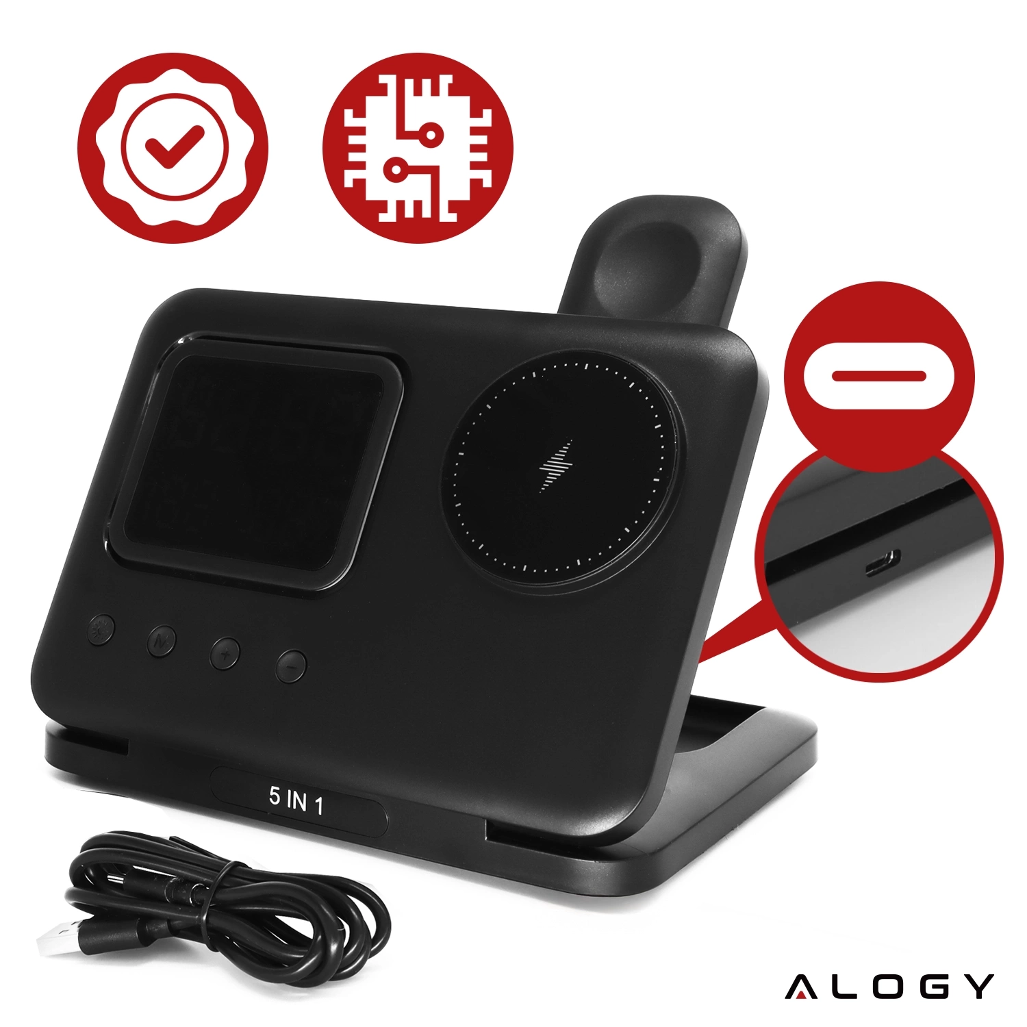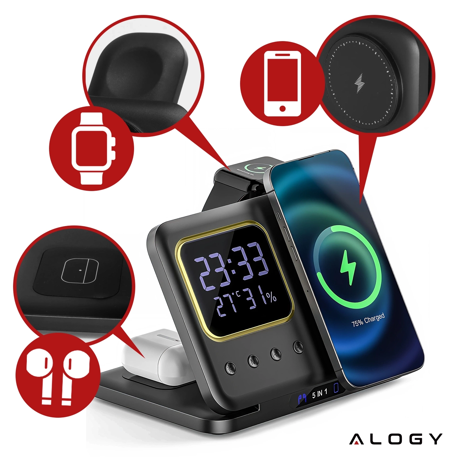 Kabellose Schnellladestation 5-in-1 mit LED-Uhr, 15 W, USB-C auf MagSafe für Apple iPhone, Watch und AirPods, inklusive Uhr und Hygrometer, Schwarz x 1