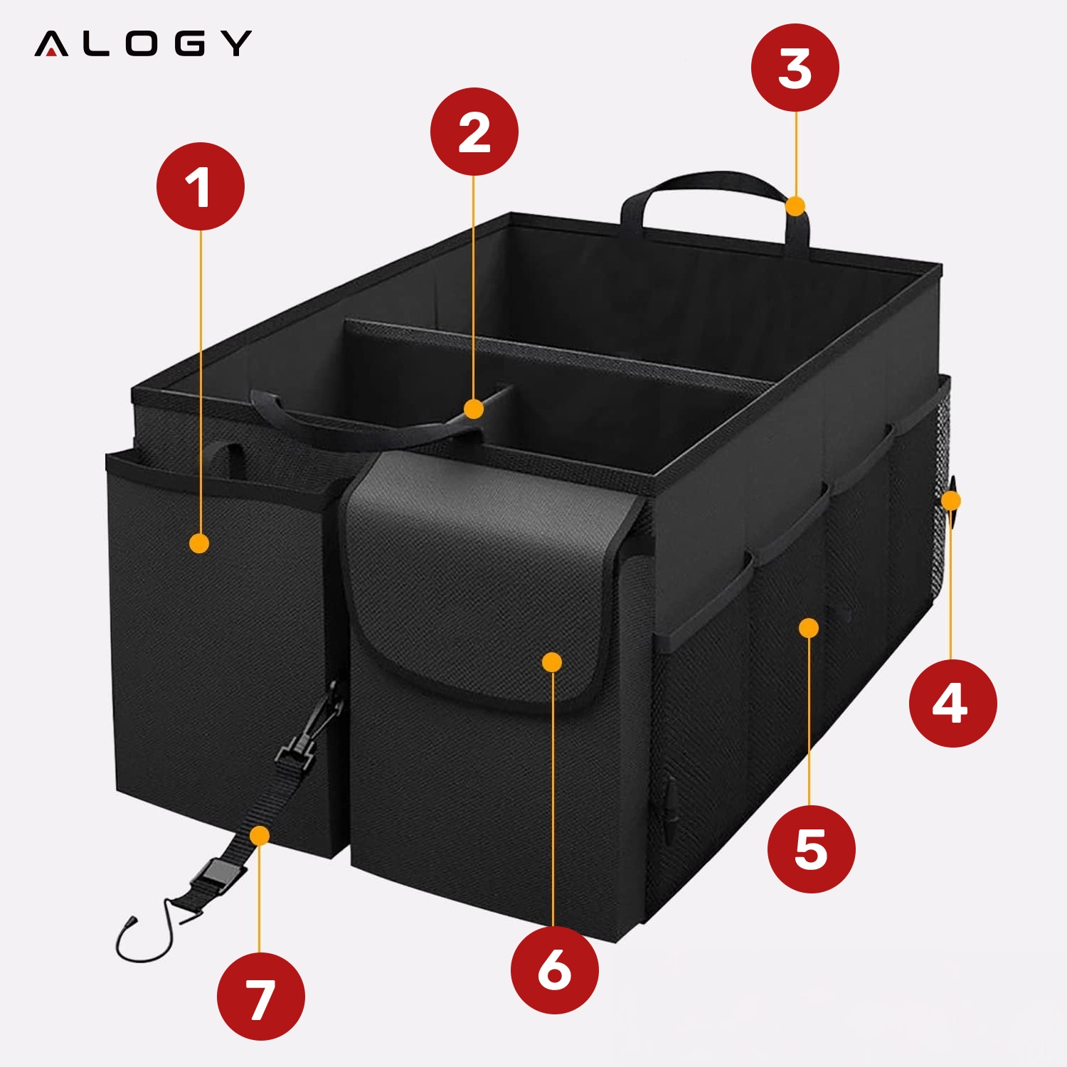 Der Organizer verfügt über einen Befestigungsgurt, mit dem Sie den Organizer an festen Elementen im Auto befestigen können. Darüber hinaus verfügt es über starke Klettverschlüsse an der Unterseite, die es vor Verrutschen schützen.