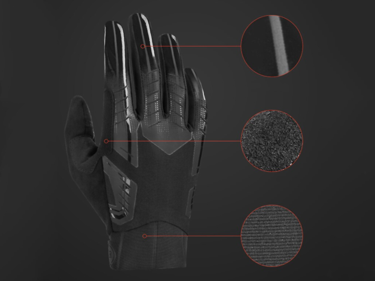 Die Handschuhe sind mit einem 3-teiligen SBR-Futter mit einer Dicke von 3 mm ausgestattet, das widerstandsfähig gegen Stöße und Stöße beim Fahren ist. Darüber hinaus verfügen die Handschuhe über die Fähigkeit, Touchscreens zu bedienen.