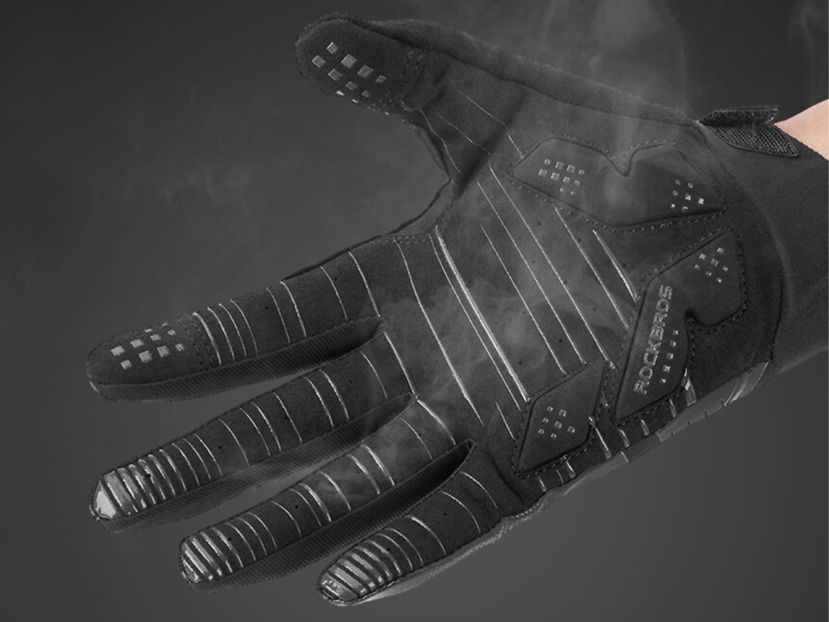 Universalhandschuhe der Marke RockBros haben ein rutschfestes Gummimuster, das für mehr Sicherheit beim Fahren sorgt. Durch den praktischen Klettverschluss können wir die Handschuhe perfekt an die Handform anpassen.