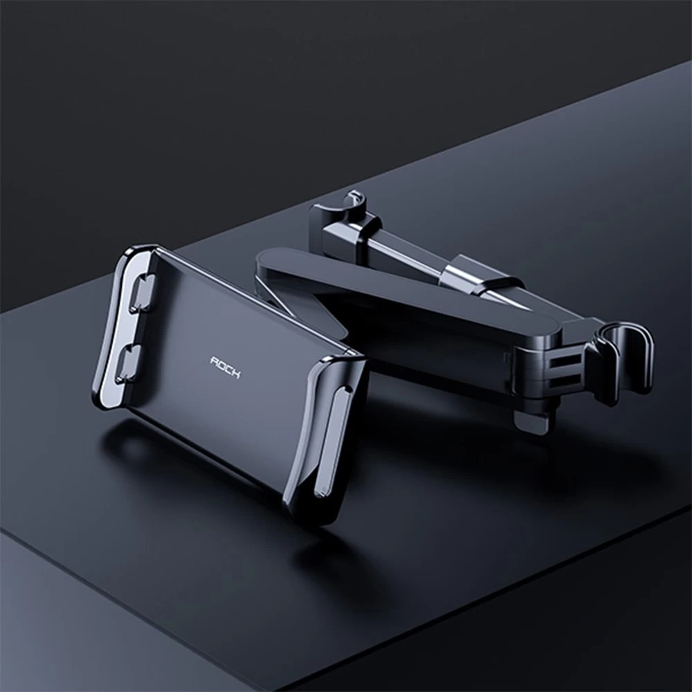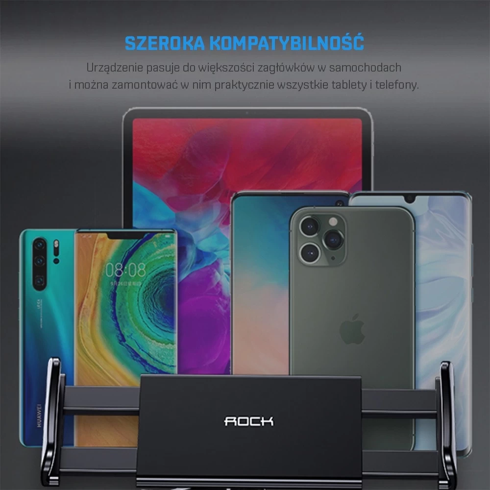 Die universelle ROCK-Kopfstützen-Autohalterung passt auf die meisten Modelle von Telefonen und Tablets mit einer Diagonale von 4,5 Zoll bis 11 Zoll. Die Halterung wird mit speziellen Aktuatoren an der Kopfstütze montiert. Sie hat einen verstellbaren Arm mit einem Bewegungsbereich von 9–26 cm und 360– Gradköpfe, was sich in Benutzerkomfort niederschlägt und eine ideale Lösung für Kinder ist, die beim Autofahren gerne Zeichentrickfilme sehen.