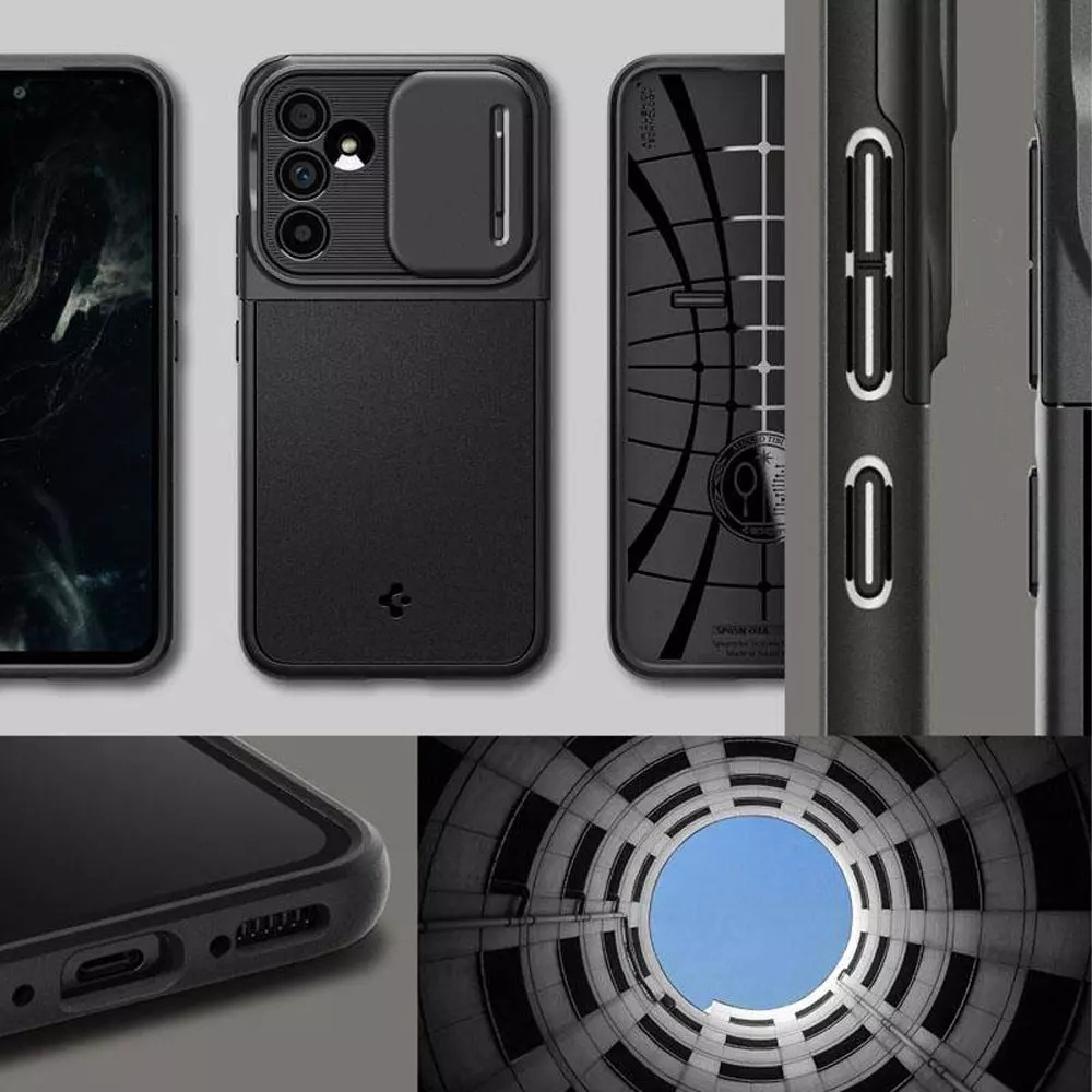 Das Gehäuse aus der Optik Armor-Serie des renommierten Unternehmens Spigen ist perfekt auf das Samsung Galaxy A54 5G abgestimmt . Die Abdeckung zeichnet sich durch eine robuste Abdeckung aus Polycarbonat für die Kamerainsel des Geräts mit einer verschiebbaren Blende aus, die es ermöglicht, den Objektivbereich vollständig abzudecken und so die Kameras noch besser zu schützen.