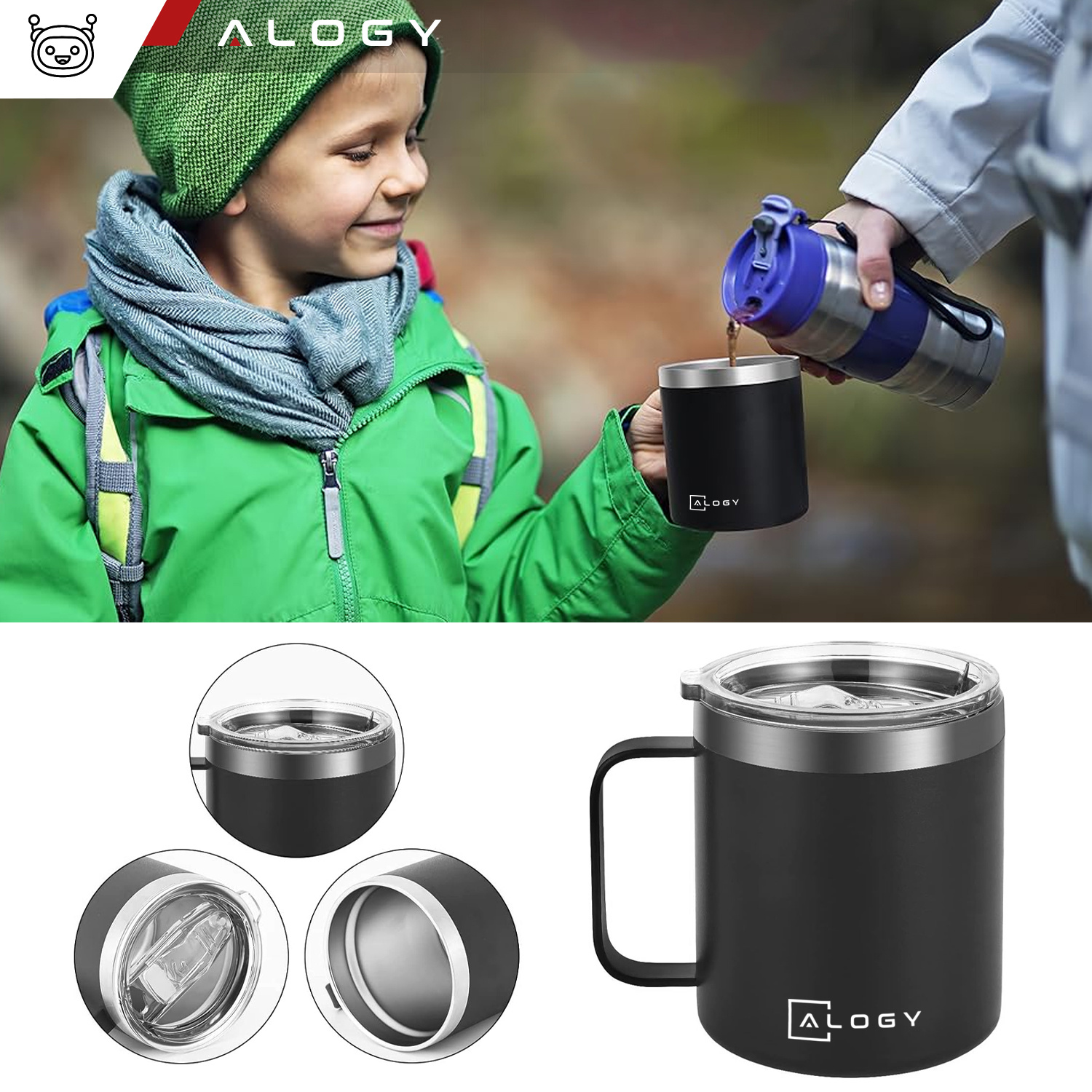 Thermobecher 420 ml mit Griffdeckel für Kaffee, Tee, kalte und warme Getränke aus Stahl, Alogy Black, Waschbürste x 1