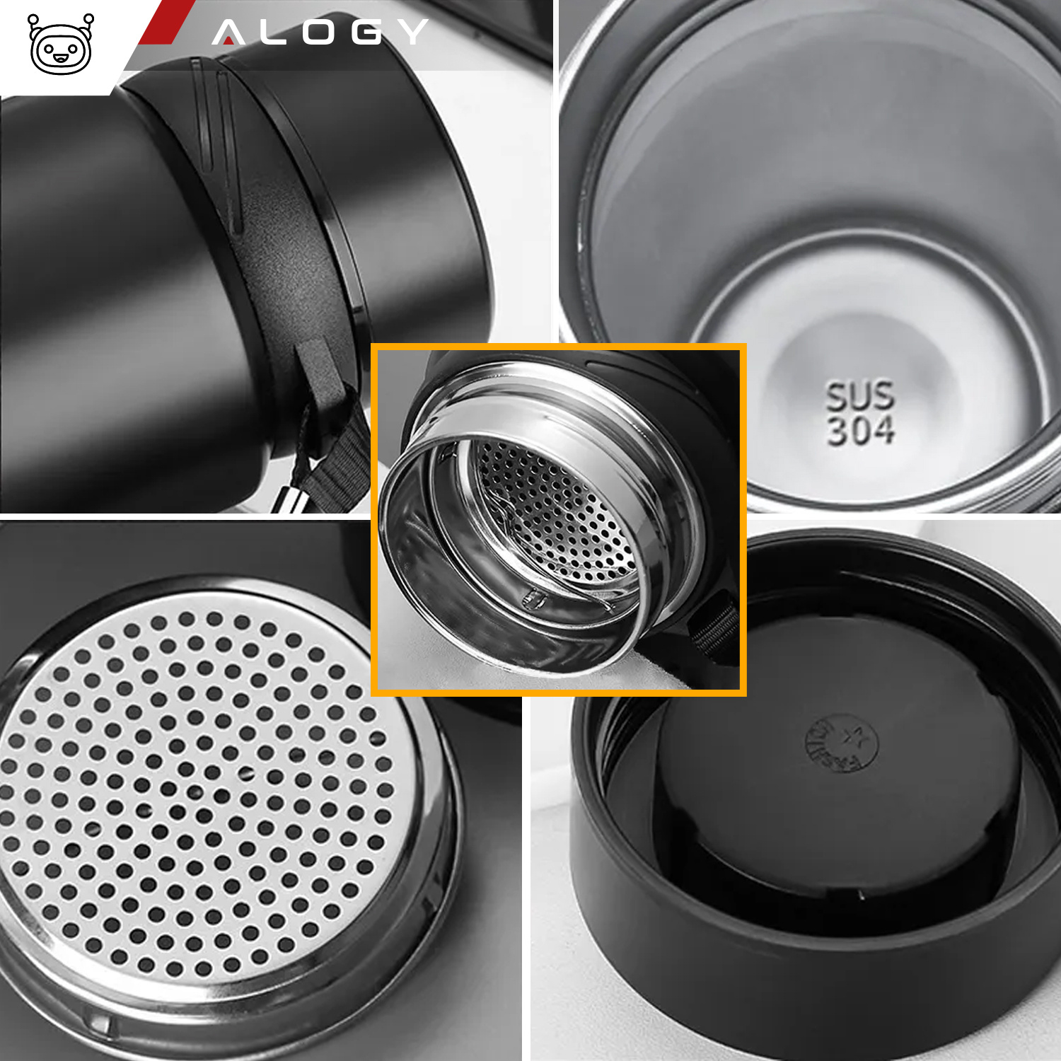 Thermoflasche in Schwarz und ein Sieb aus Stahl (im Inneren der Flasche).