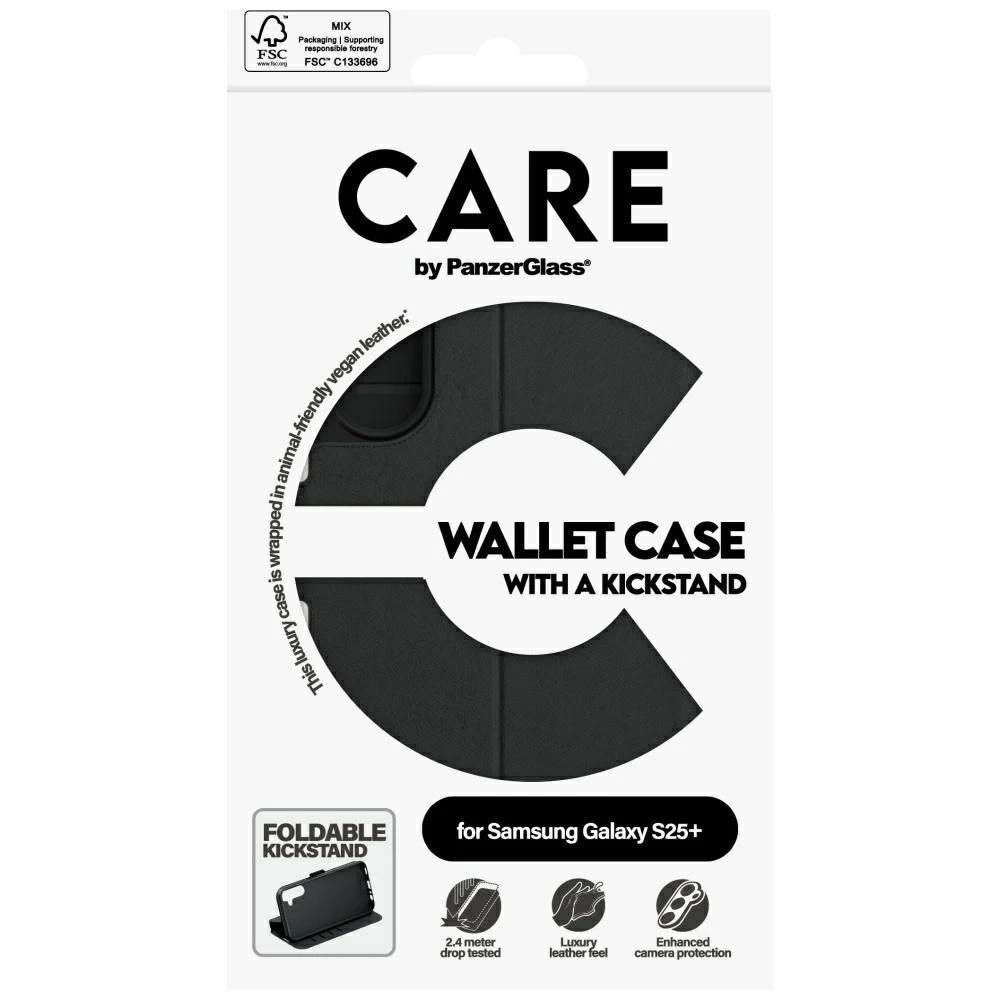 Das CARE by PanzerGlass Wallet Case mit Kickstand vereint Eleganz, Funktionalität und einen nachhaltigen Ansatz zum Schutz Ihres Smartphones. Das speziell für das Samsung Galaxy S25 Plus entwickelte Case besteht aus hochwertigem veganem Leder und sieht dadurch luxuriös aus, ist aber gleichzeitig tier- und umweltfreundlich.