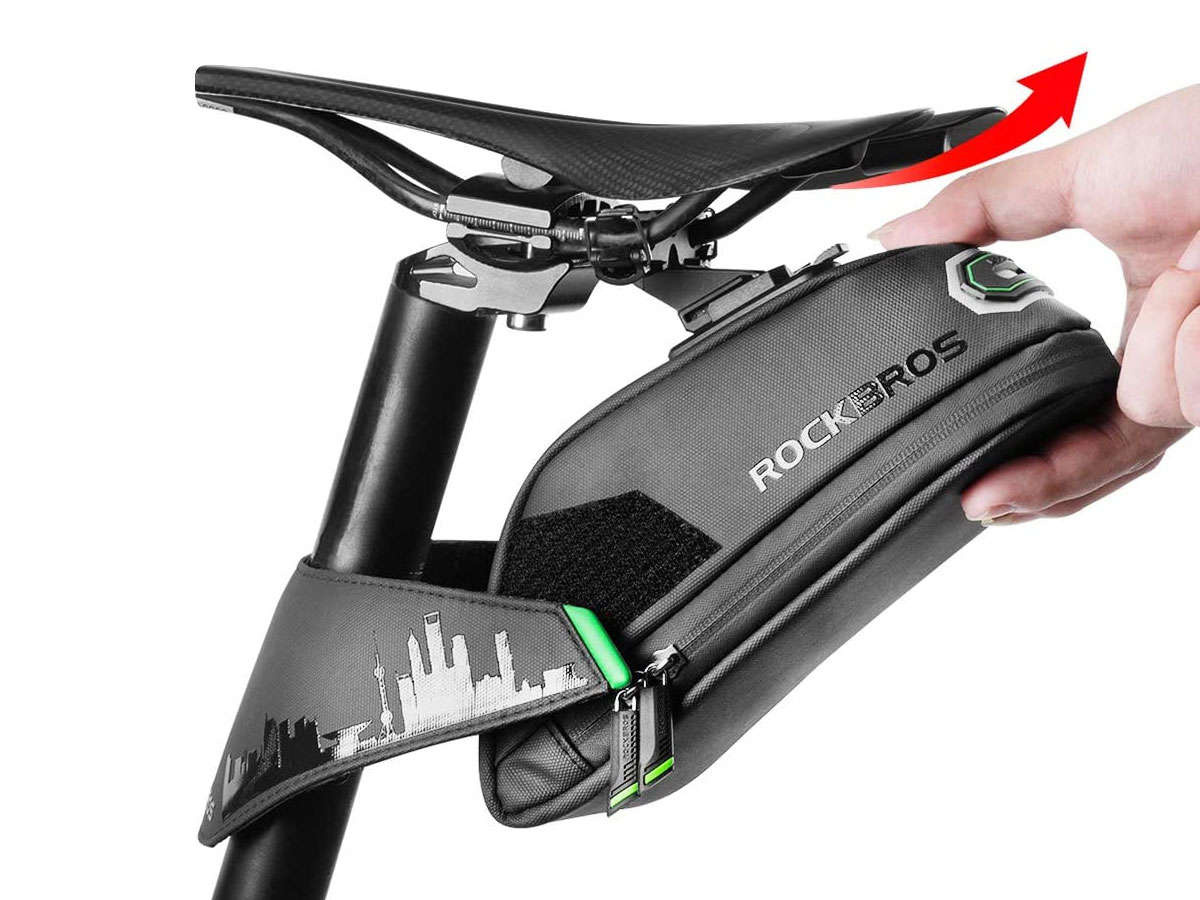 Die RockBros Packtasche wird unter dem Sattel montiert. Darüber hinaus befindet sich im Inneren des Beutels eine zusätzliche Tasche, in der Sie die darin enthaltenen Gegenstände organisieren können.