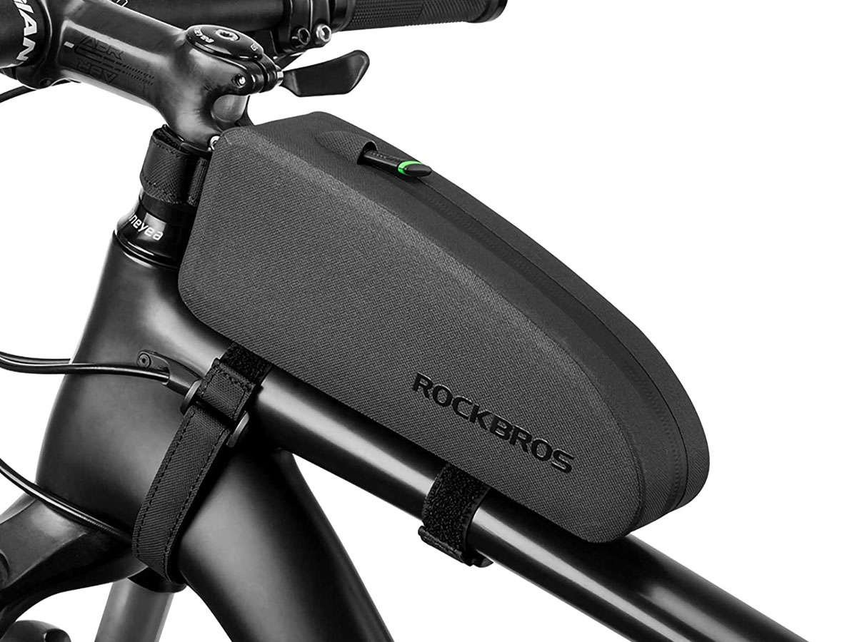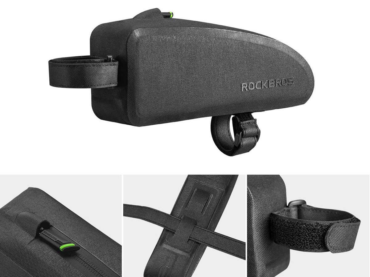 Die Montage der RockBros Fahrradtasche am Rahmen unseres Fahrrads geht ganz einfach dank der im Set enthaltenen speziellen Klettverschlüsse.