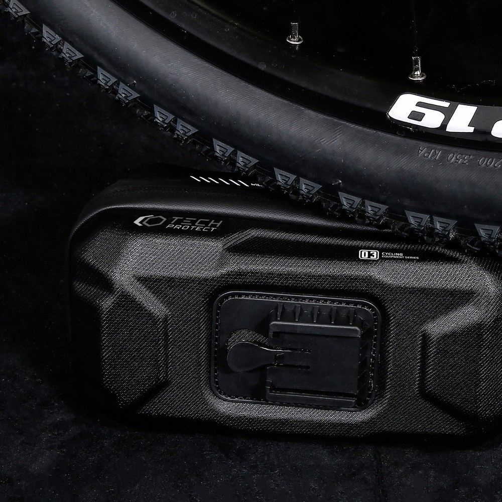 XT3, eine praktische Fahrradtasche der Marke Tech-Protect, montiert am Fahrradvorbau. Die Tasche eignet sich perfekt als Aufbewahrungsort für kleine Gegenstände wie Powerbank, Geldbörse oder Schlüssel. Die Tasche besteht aus staub- und wasserdichtem, schlagfestem PC-Material, mit einem taktilen, transparenten Fenster auf der Vorderseite (17,5 x 8,5 cm). Mit dieser Lösung können Sie das Telefon während der Fahrt verwenden, ohne das Gerät von der Abdeckung zu entfernen.