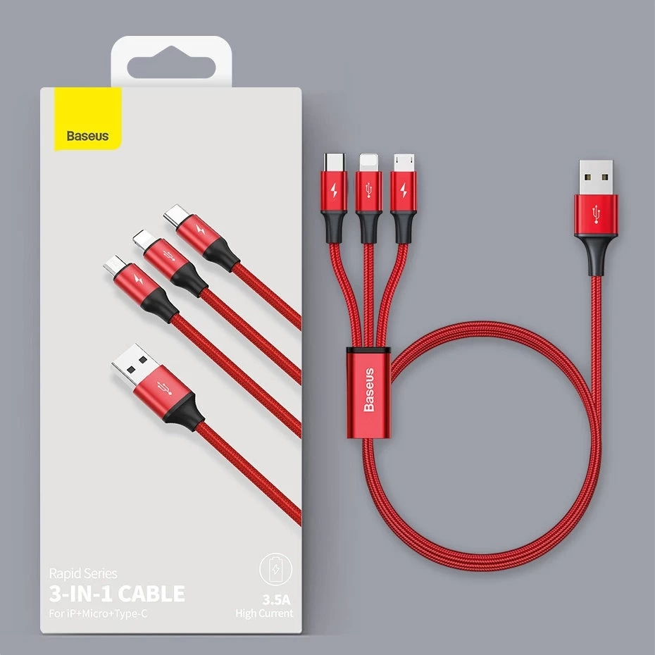 Kabel Baseus Rapid 3 w 1 ze złączami USB - USB Typ C / Lightning / micro USB do ładowania i przesyłania danych o długości 1,2 m - czerwony (CAJS000009)