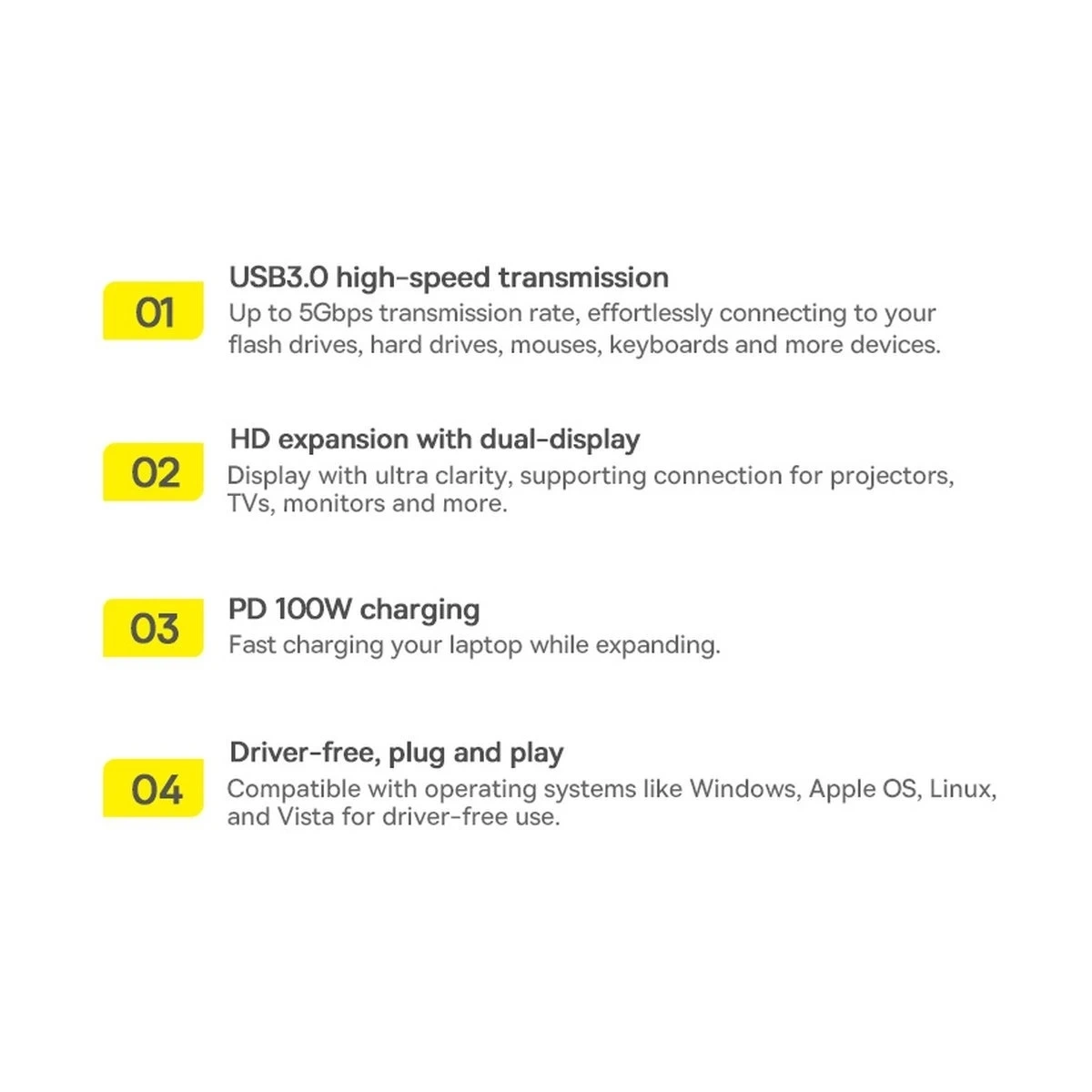 Korzystając z komputera lub laptopa, zdarzyło Ci się, że zabrakło wolnych gniazd do podpięcia kolejnych urządzeń? Mała ilość standardowych złączy USB może być frustrująca. Gadżet od Baseus nie tylko rozwiąże ten problem. To również szereg innych wygodnych rozwiązań, które sprawią, że korzystanie z komputera czy laptopa będzie znacznie wygodniejsze.