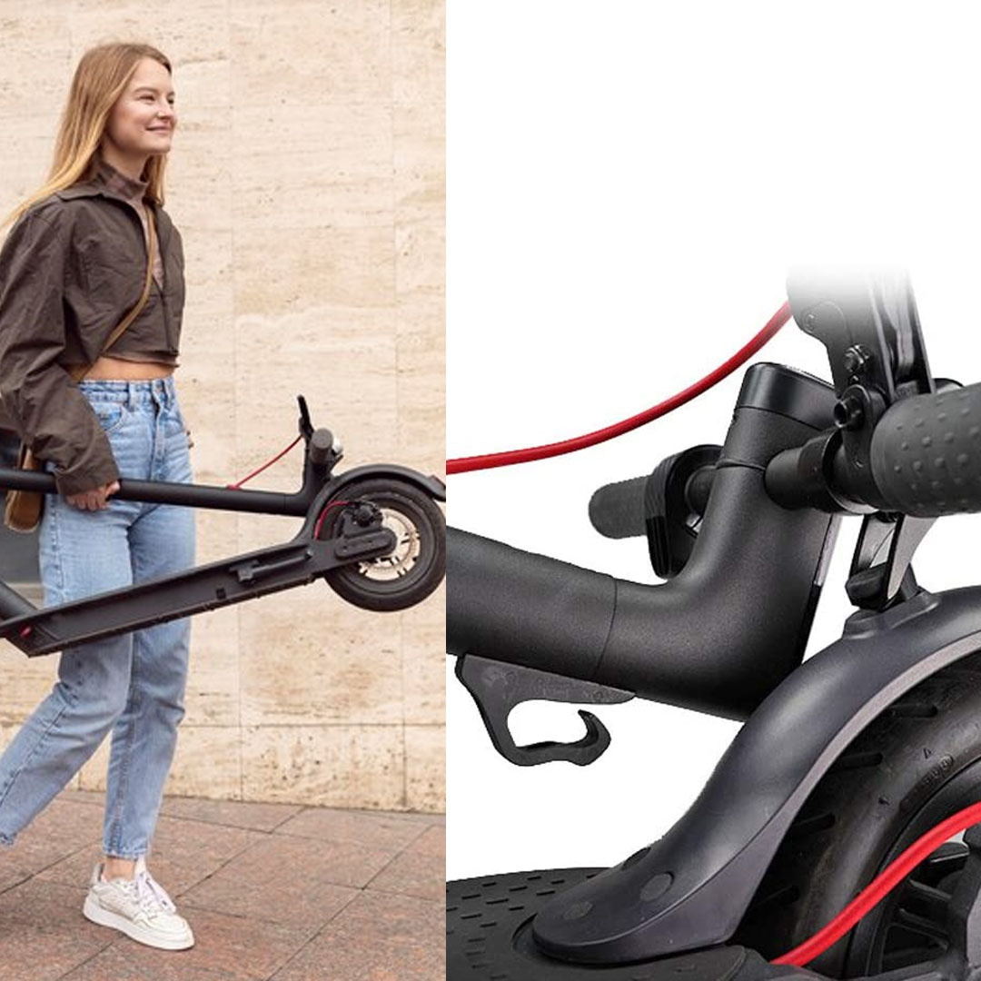 Zamocowany na tylnym kole błotnik zapewnia komfort podczas jazdy jak i przenoszenia hulajnogi. Specjalny haczyk dołączony do zestawu, pozwala na zaczepienie kierownicy, gdy złożymy hulajnogę i chcemy ją przenieść.
