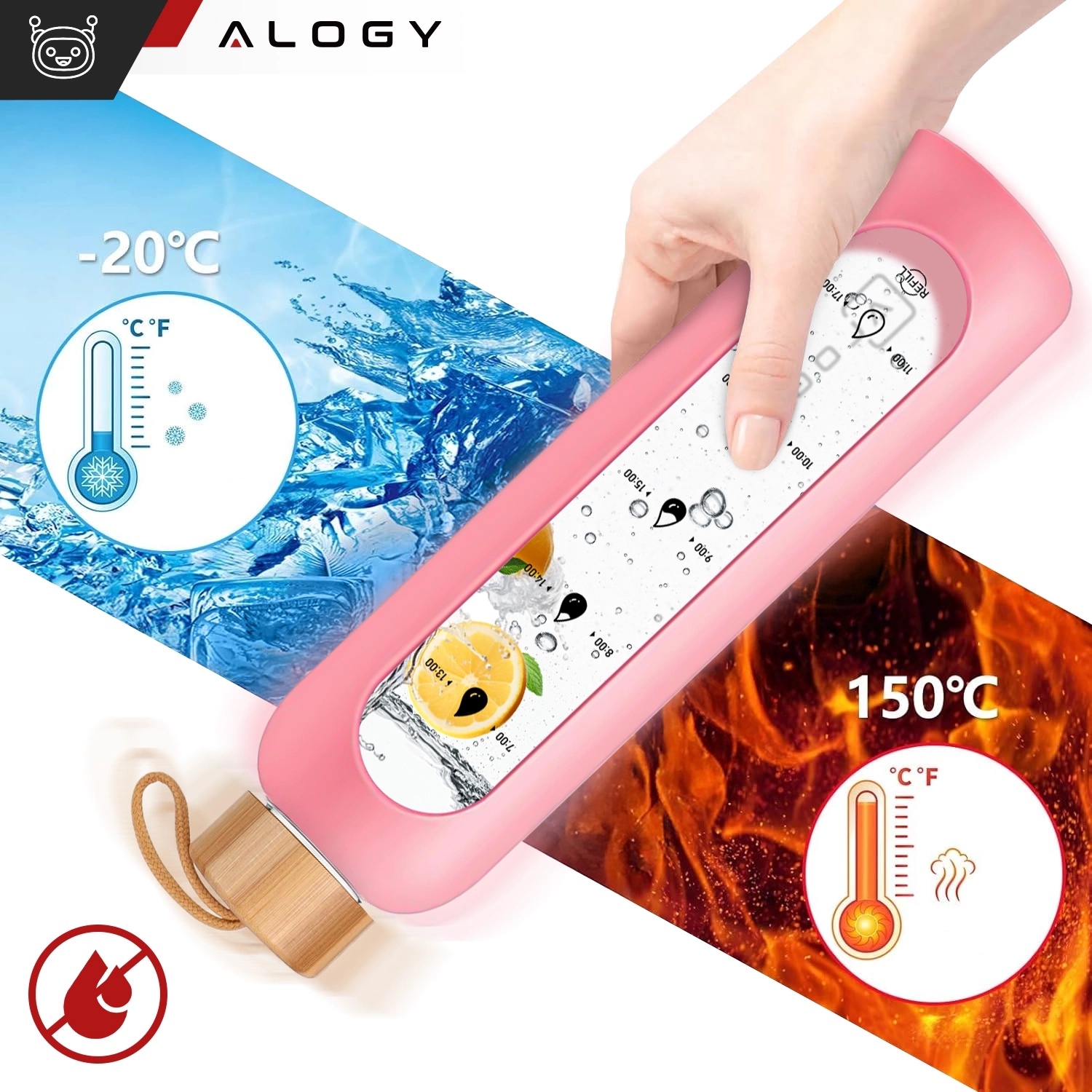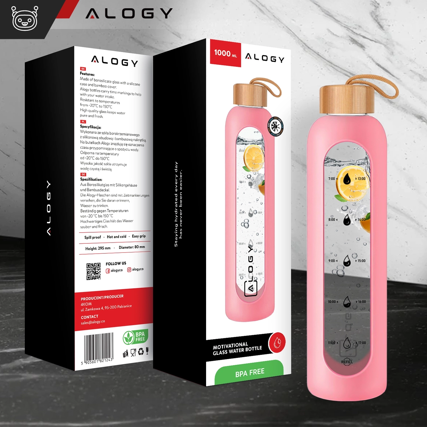 Opinie o Butelka szklana duża bidon na napoje do picia Alogy Miarka motywacyjna 1l 1000ml etui silikonowe Różowa