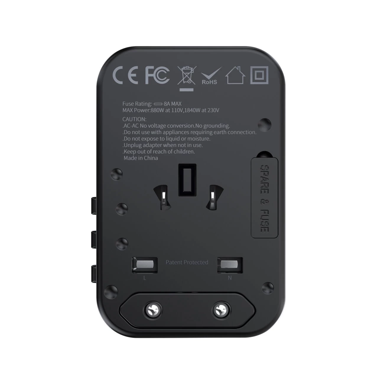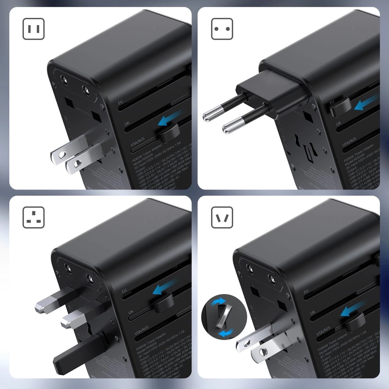 • Wysuwane wtyczki: europejska, brytyjska, amerykańska / australijska