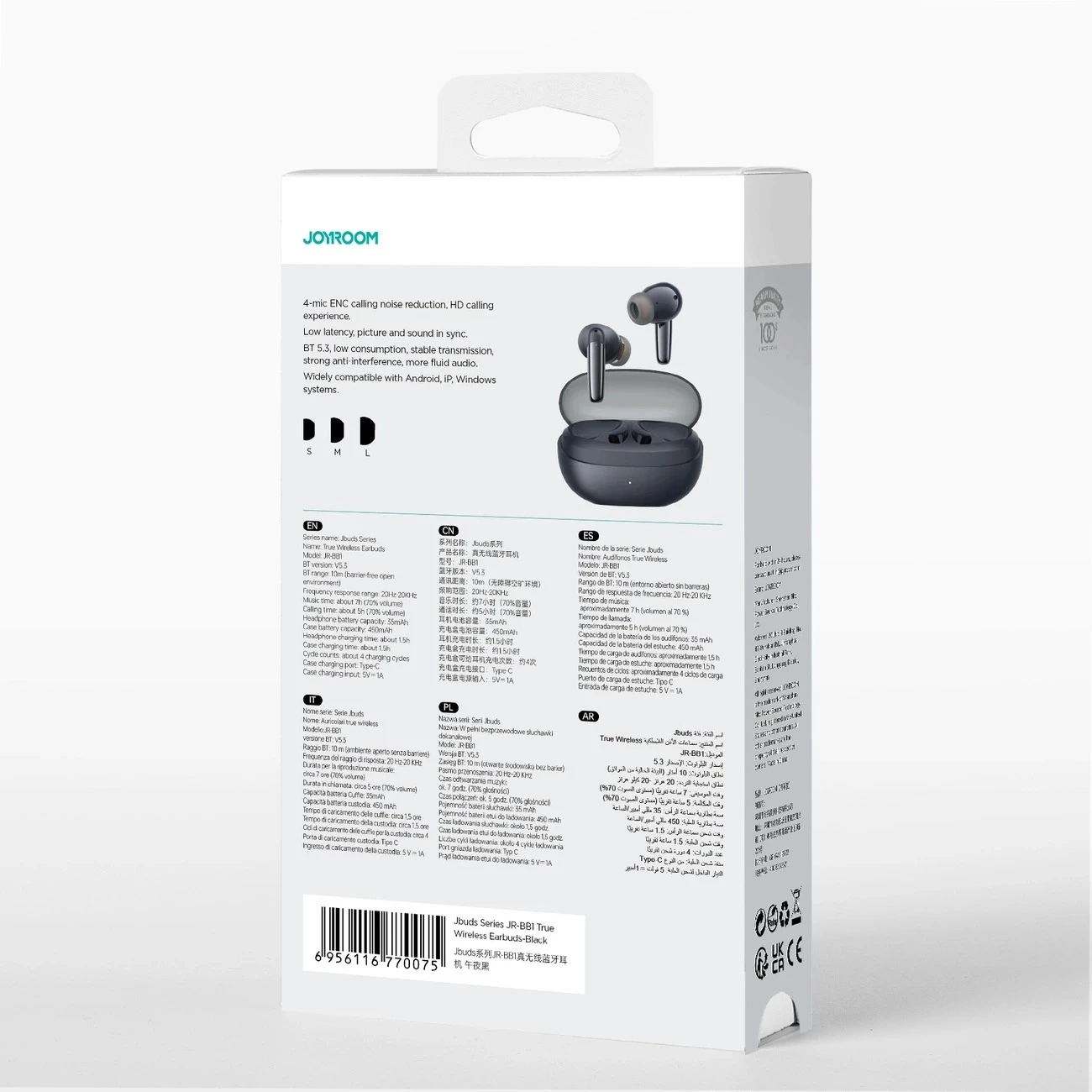 Douszne słuchawki bezprzewodowe Joyroom Jbuds Series JR-BB1 TWS - czarne Joyroom Jbuds Series JR-BB1 to douszne słuchawki TWS z Bluetooth 5.3, redukcją hałasu ENC i niskim opóźnieniem. Do 7 h odtwarzania (35 h z etui 450 mAh), szybkie ładowanie 10 min→1 h, ergonomiczne nasadki (4 pary), odporność IPX4. Kup 8 szt. , oszczędź 20 % - 58,32 zł / szt.