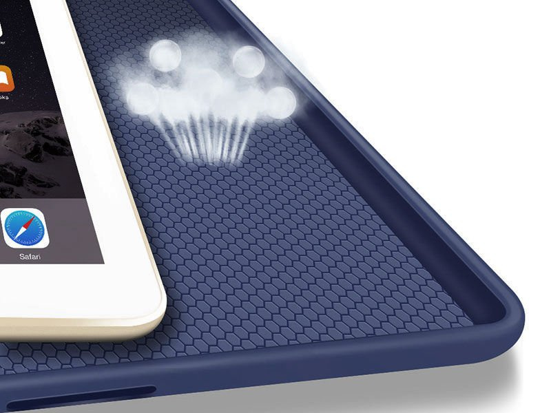 Całość została wykonana w starym stylu tzw. książki, w którym zarówno przednia nakładka jak i tylna stanowią jedność. Tylny panel jest wykonany z elastycznego TPU, dzięki czemu idealnie przylega do iPada. Dodatkowo panel ten został wyposażony w technologię poduszek powietrznych, co gwarantuje jeszcze większe bezpieczeństwo naszego urządzenia podczas niespodziewanych upadków, a specjalna struktura "sieci pajęczej" zabezpieczy urządzenie przed przegrzaniem. Etui posiada funkcję wybudzania urządzenia - Sleep / Wake, co wpływa znacząco na dłuższą żywotność baterii.