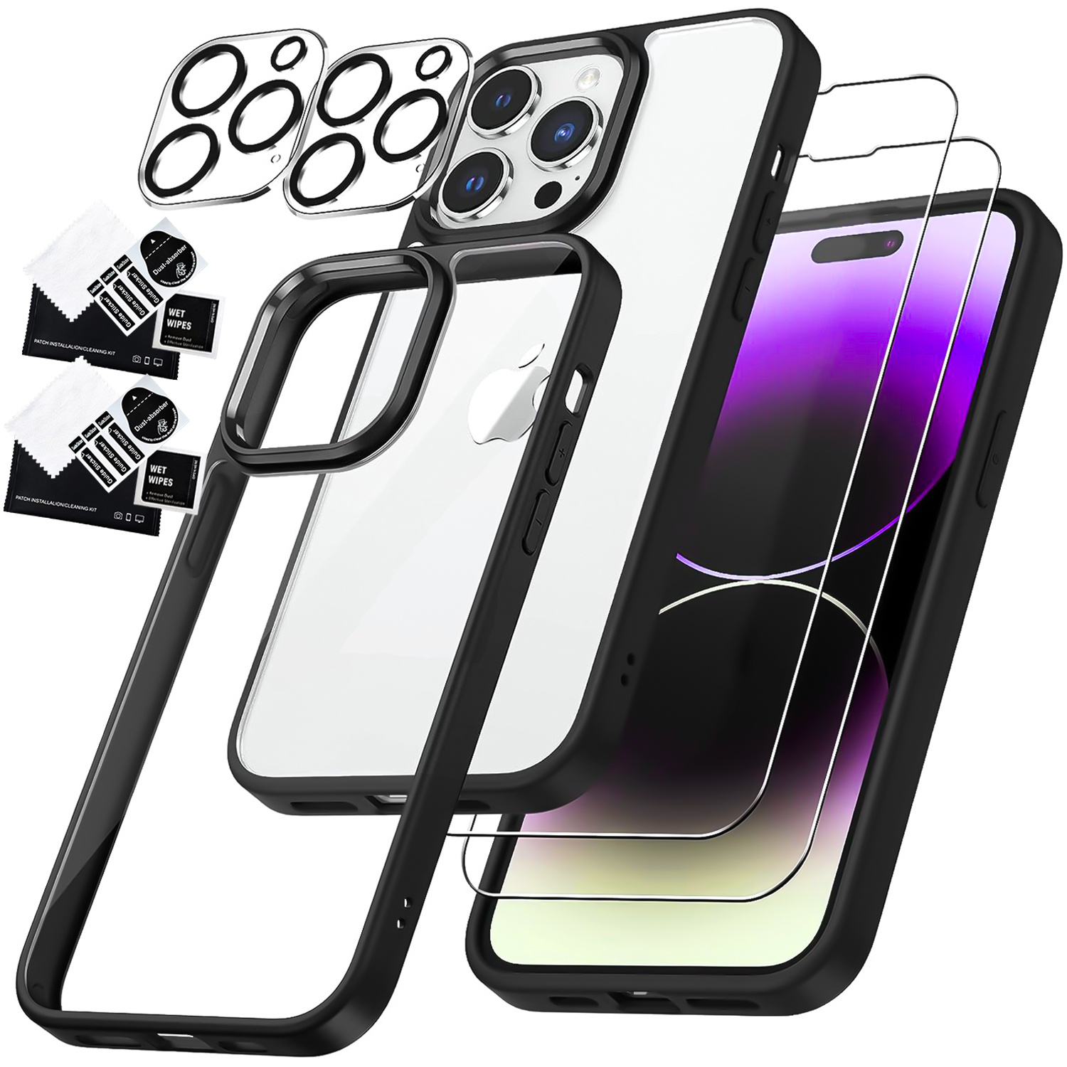 Etui Case do iPhone 14 Pro + zestaw 4 szkieł 5w1 pancerne 360 Alogy Hybrid 2x Szkło na ekran +2x obiektyw czarno-przezroczyste