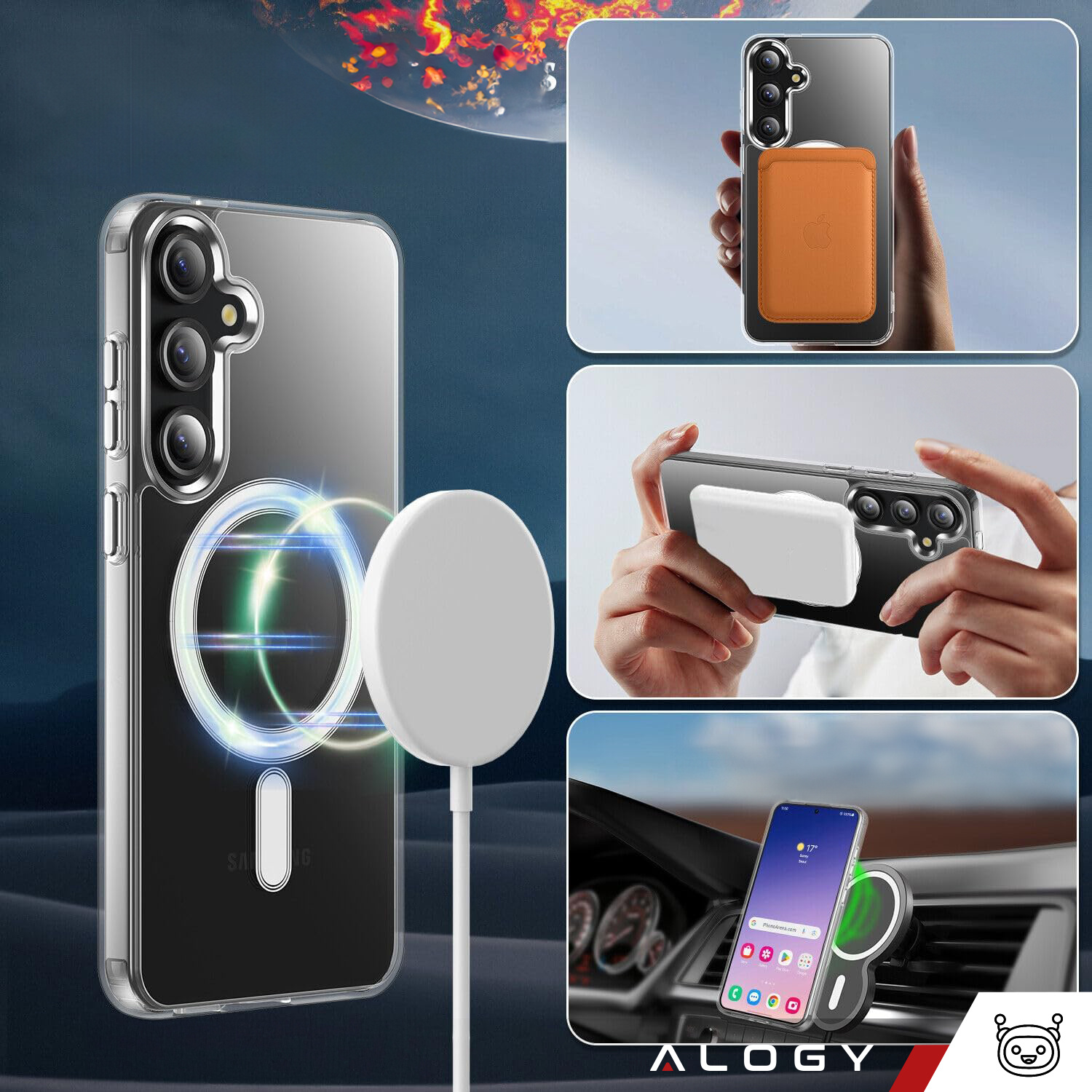 Tak, etui Alogy Mag Cover Shock Clear posiada wbudowany magnes na tyle i jest kompatybilne z funkcją bezprzewodowego ładowania oraz innymi akcesoriami Mag Safe, dzięki czemu możesz ładować swój Samsung Galaxy S24 bez konieczności zdejmowania etui.