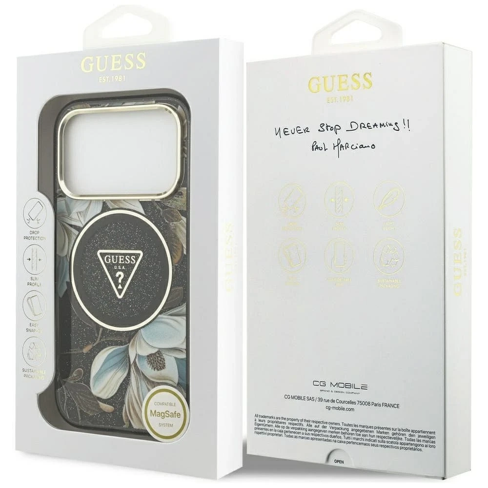 Etui Guess IML Glitter Flowers Triangle MagSafe do iPhone 17 Pro to połączenie luksusowego stylu i praktycznej ochrony. Czarna kolorystyka z kwiatowym wzorem i brokatową powierzchnią sprawia, że smartfon zyskuje prestiżowy wygląd. Subtelne logo Guess oraz elegancki design kolekcji Glitter Flowers Triangle czynią z etui wyjątkowy dodatek, który wyróżnia się na tle innych akcesoriów.