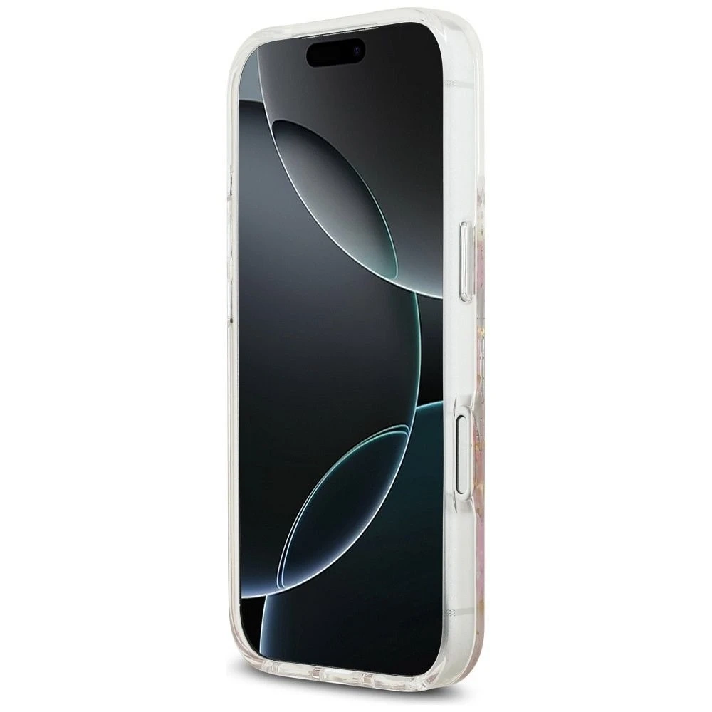 • Ekskluzywne etui Guess Resin Flowers Glitter do iPhone 17 Pro w różowym kolorze z kwiecistym wzorem i brokatowym wykończeniem. Kompatybilne z MagSafe, chroni telefon przed uszkodzeniami i podkreśla jego elegancję.