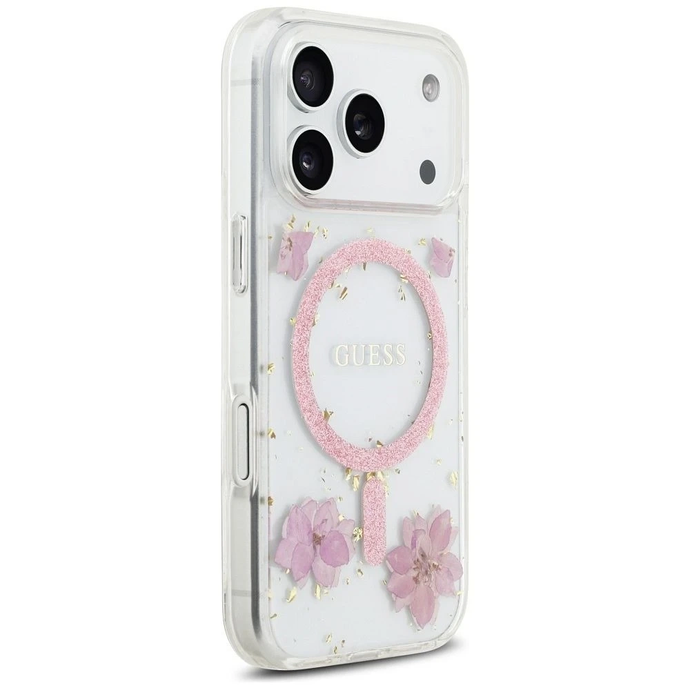 Etui Guess MagSafe do iPhone 17 Pro Resin Flowers Glitter Pink