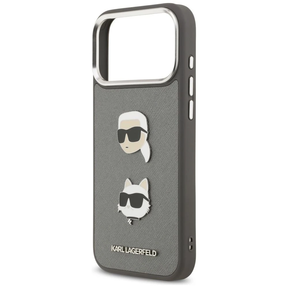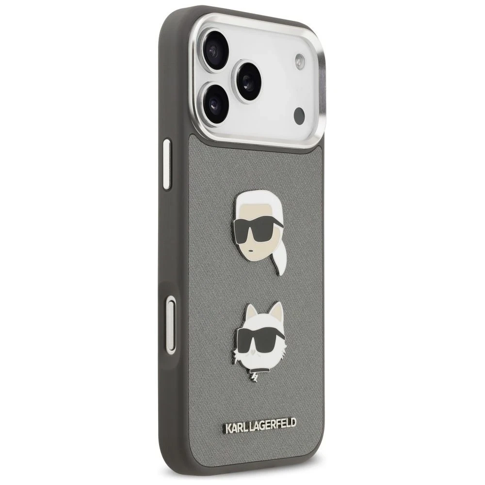 Etui Karl Lagerfeld FW Grained Karl & Choupette Heads Pins & Logo do iPhone 17 Pro Max to połączenie luksusu, nowoczesnego designu i praktycznej ochrony. Szare wykończenie o ziarnistej fakturze nadaje mu wyjątkowego charakteru, a ozdobne detale w postaci głów Karl i Choupette podkreślają modowy styl.
